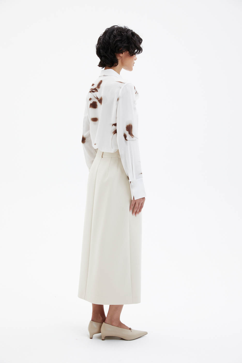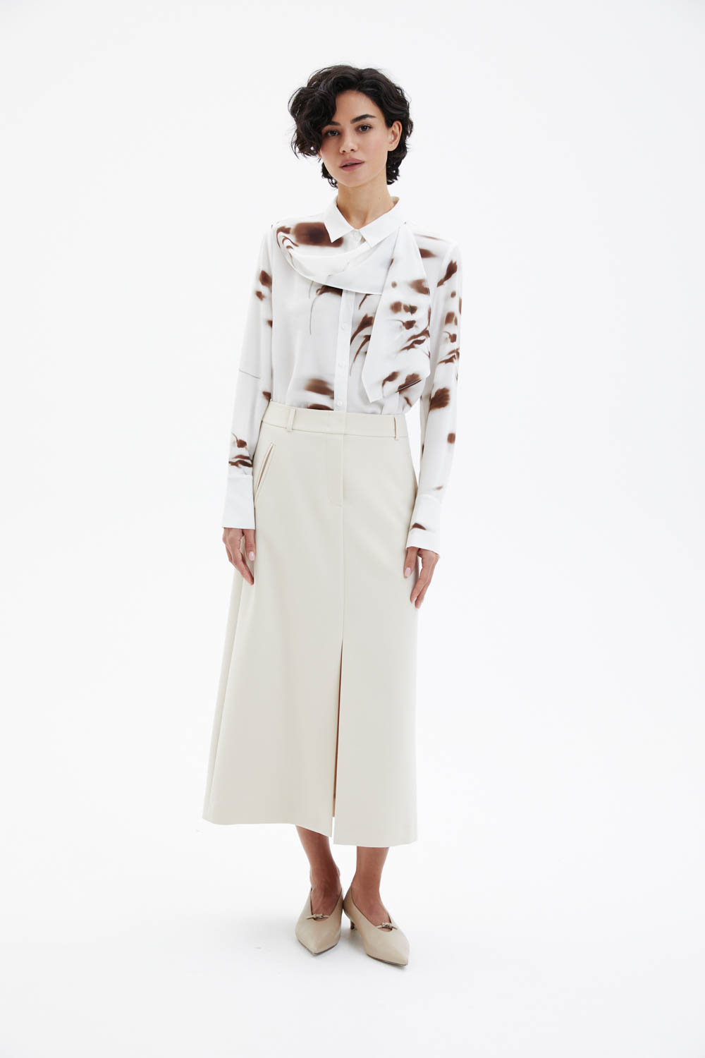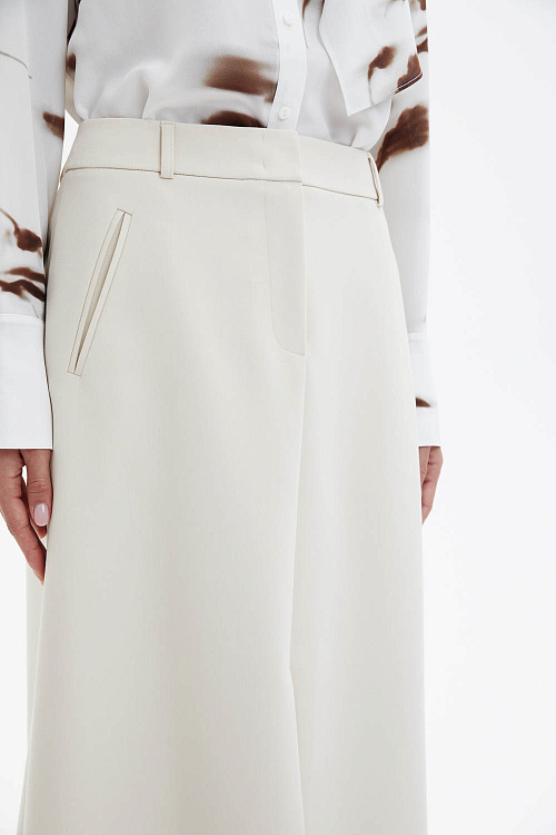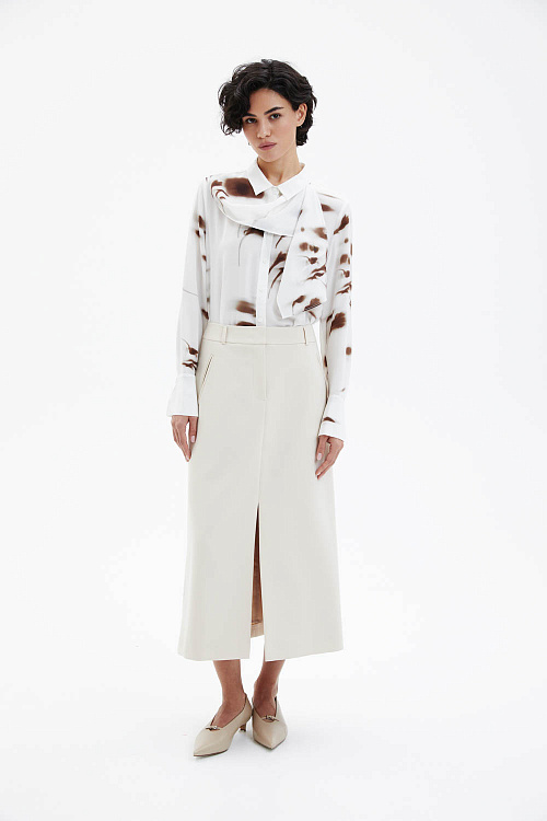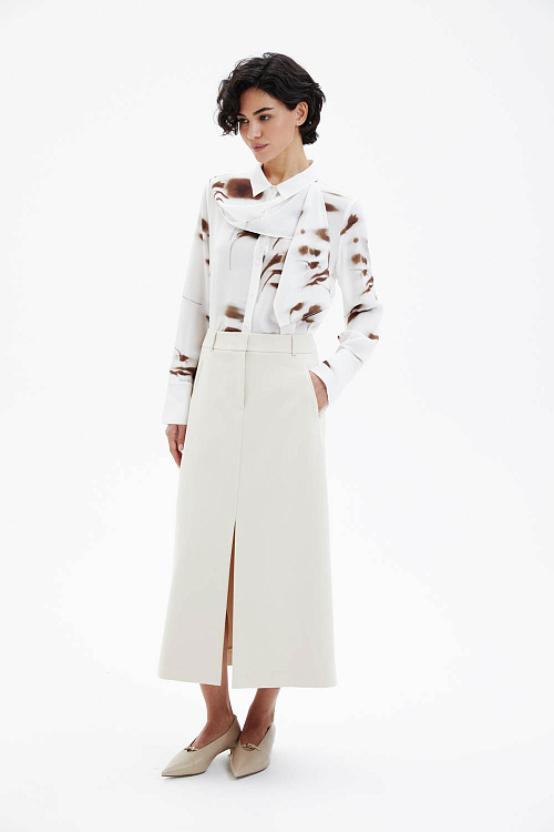 Юбка миди прямого силуэта цвета экрю выполнена из мягкой костюмной ткани и имеет аккуратную посадку за счёт застёжки на молнию и потайные крючки. Юбка имеет прорезные карманы в рамку, а также высокий разрез по среднему шву. На спинке — только вытачки, обеспечивающие аккуратное прилегание. Мягкая фактура ткани формирует плавные вертикальные линии и помогает юбке держать форму, сохраняя комфорт в носке.