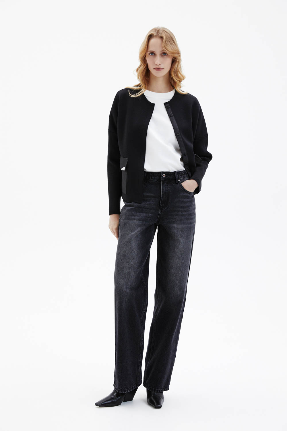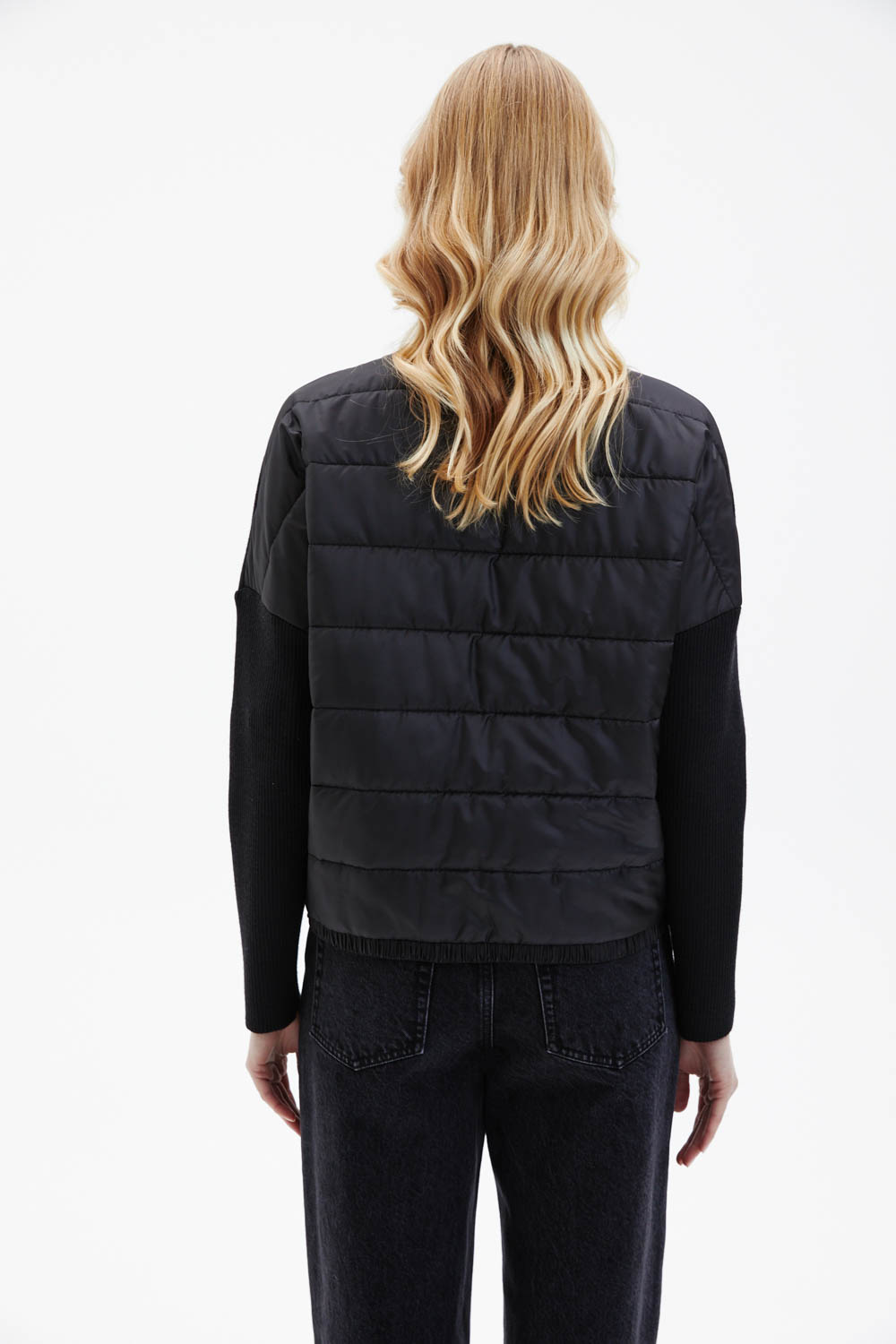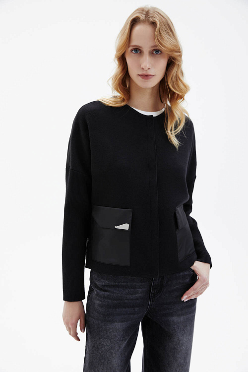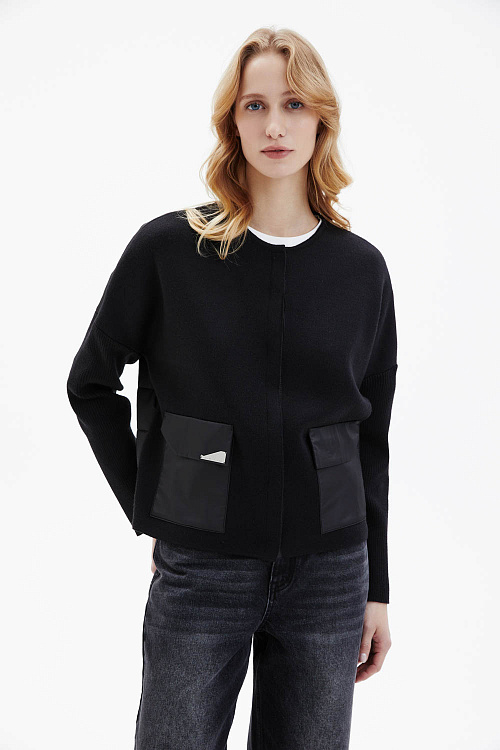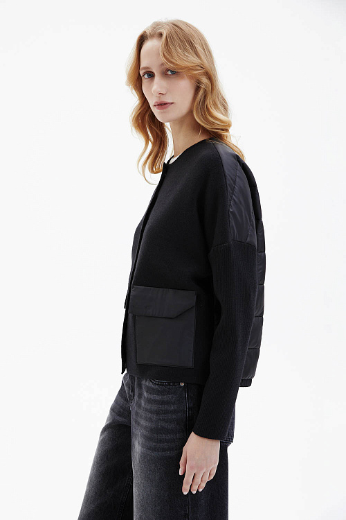 Жакет прямого кроя чёрного цвета выполнен из плотного трикотажа и дополнен карманами из плащевки. Модель застёгивается на молнию. Крупные накладные карманы придают изделию современный утилитарный акцент. Спинка выполнена из стёганого материала.