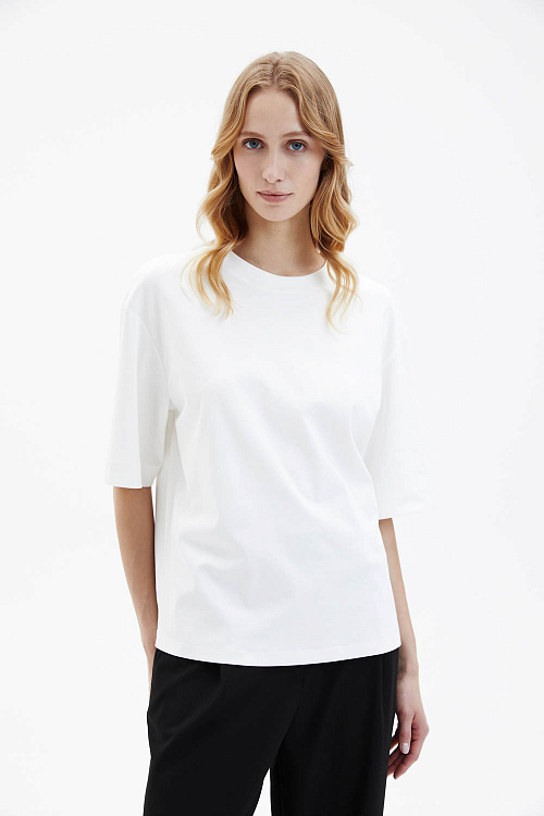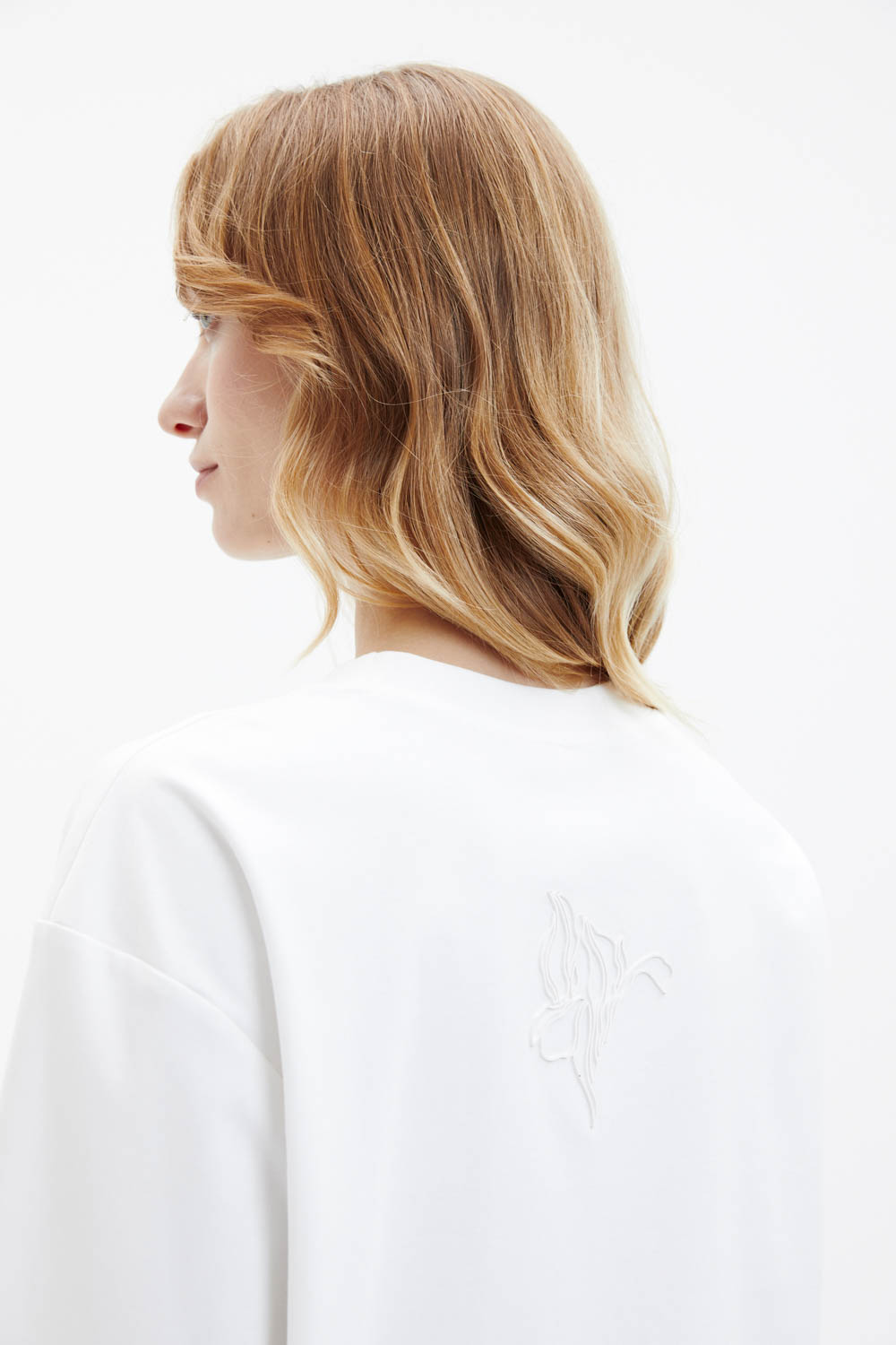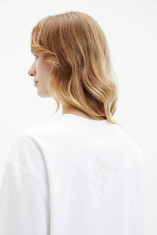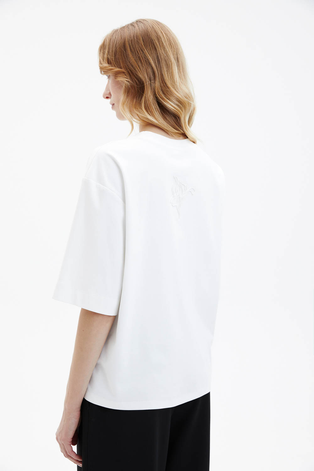 Футболка прямого кроя выполнена из мягкого трикотажа и имеет слегка приспущенную линию плеча, создающую расслабленный силуэт. Горловина обработана резинкой, что обеспечивает аккуратную посадку и держит форму. Чистый молочный оттенок делает модель универсальной и лёгкой для сочетаний. Лаконичный дизайн дополнен аккуратным прорезиненным принтом в виде контура цветка на спинке — он выполнен в тон ткани и выступает деликатным декоративным акцентом. Отсутствие боковых разрезов сохраняет чистоту линий и подчеркивает минималистичный характер модели.