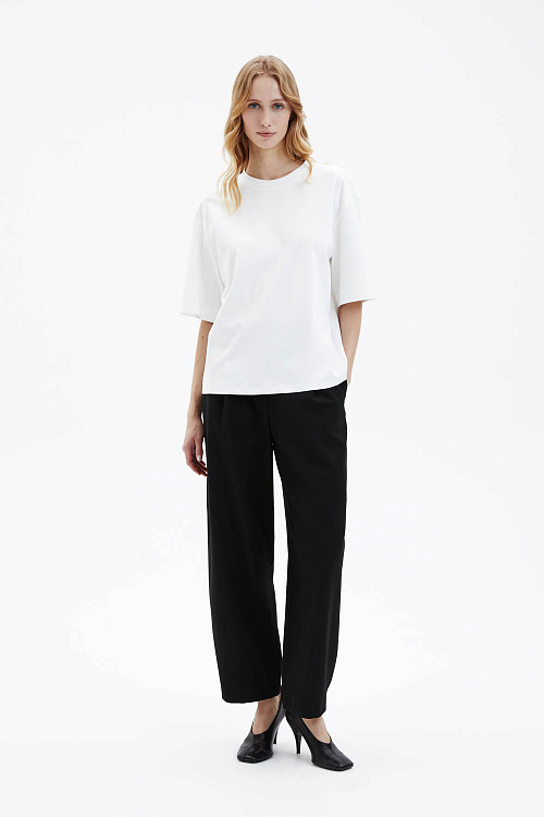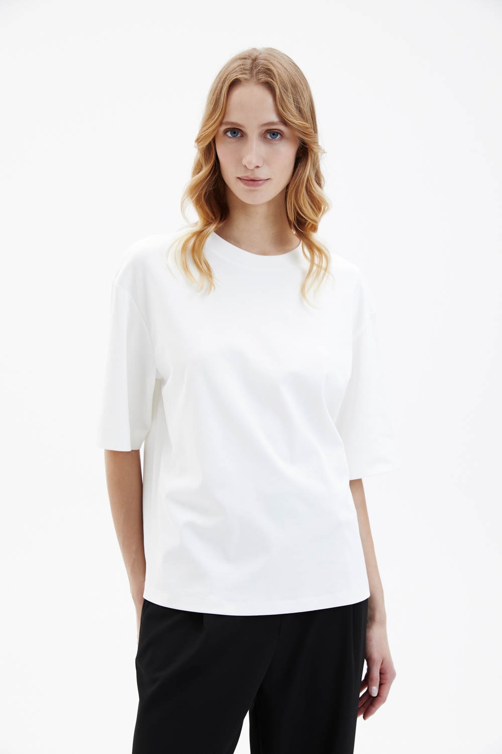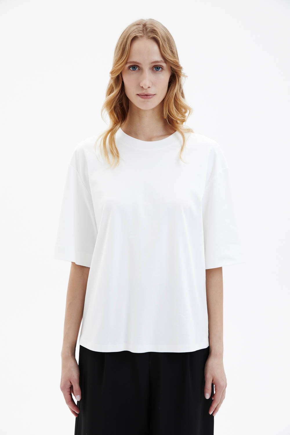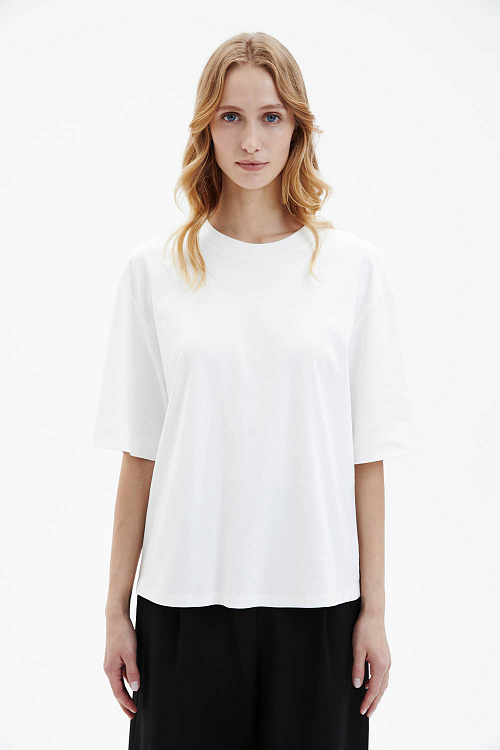 Футболка прямого кроя выполнена из мягкого трикотажа и имеет слегка приспущенную линию плеча, создающую расслабленный силуэт. Горловина обработана резинкой, что обеспечивает аккуратную посадку и держит форму. Чистый молочный оттенок делает модель универсальной и лёгкой для сочетаний. Лаконичный дизайн дополнен аккуратным прорезиненным принтом в виде контура цветка на спинке — он выполнен в тон ткани и выступает деликатным декоративным акцентом. Отсутствие боковых разрезов сохраняет чистоту линий и подчеркивает минималистичный характер модели.