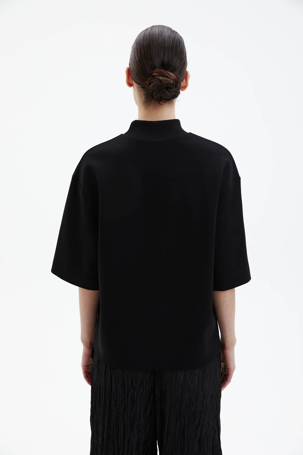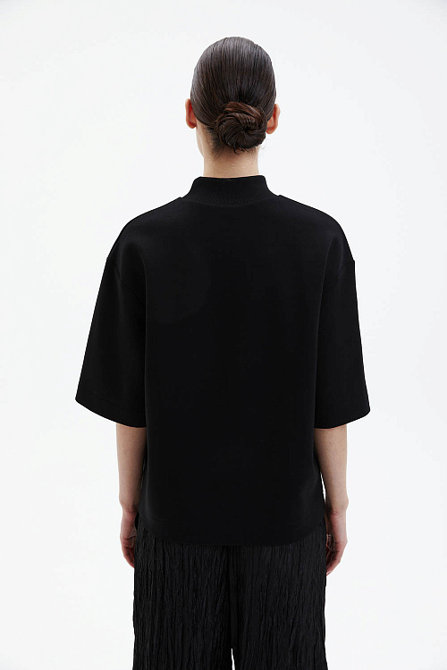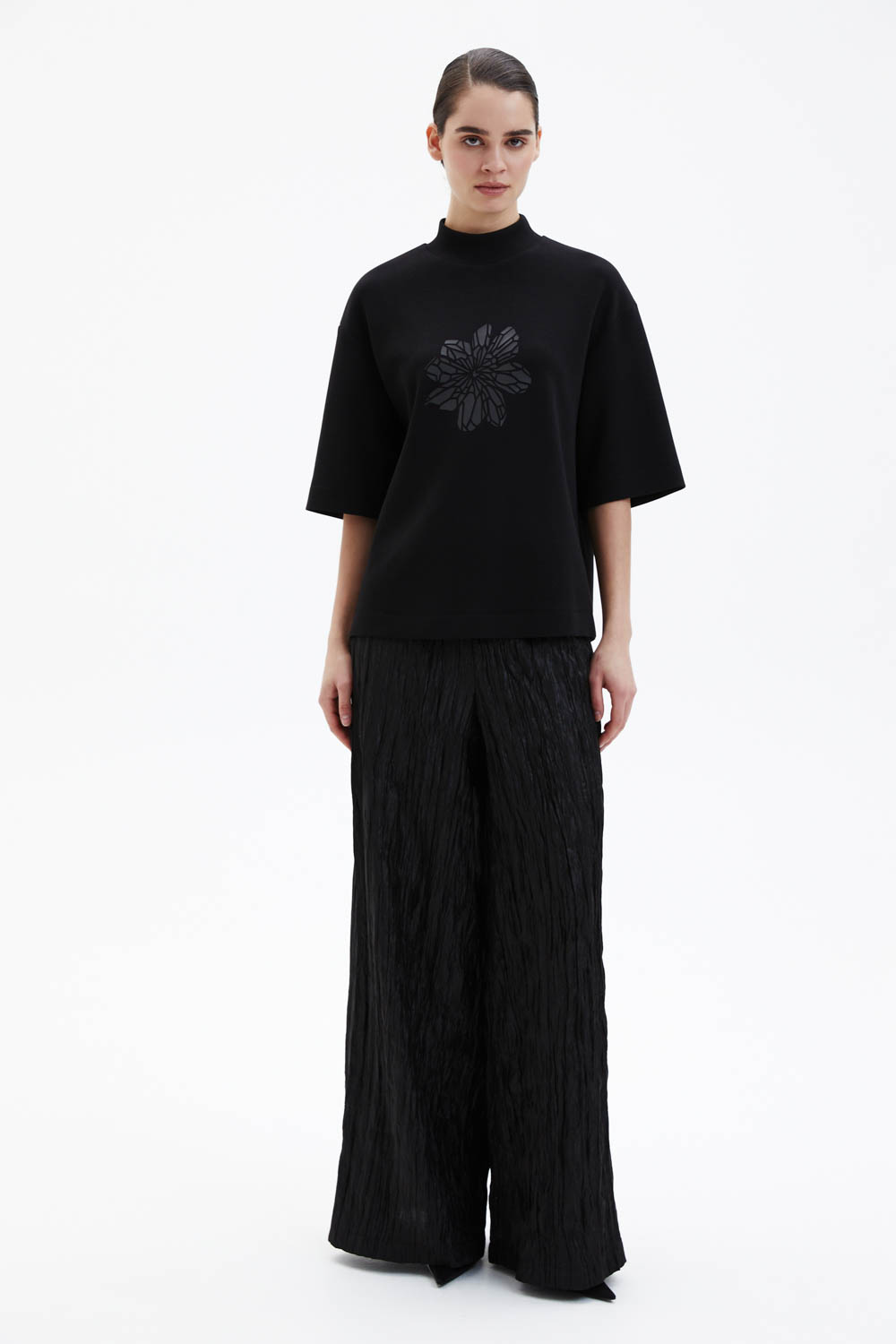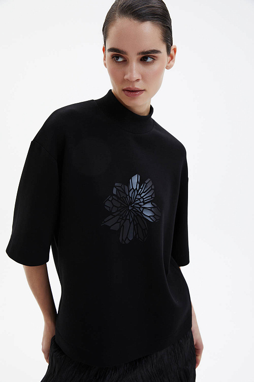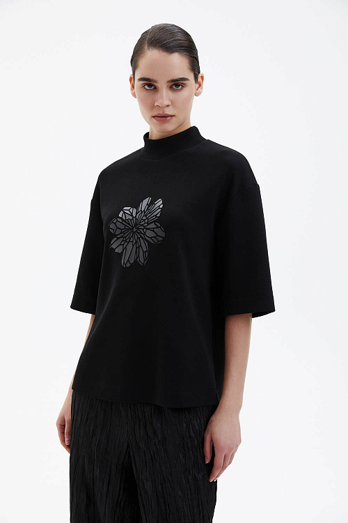 Футболка выполнена из плотного трикотажа чёрного цвета и имеет прямой, слегка объёмный крой с укороченным рукавом и аккуратной высокой горловиной. Лаконичный силуэт подчёркнут декоративной аппликацией в виде графичного цветочного мотива на передней части, выполненной в тон изделия и создающей эффект глубины и фактуры.