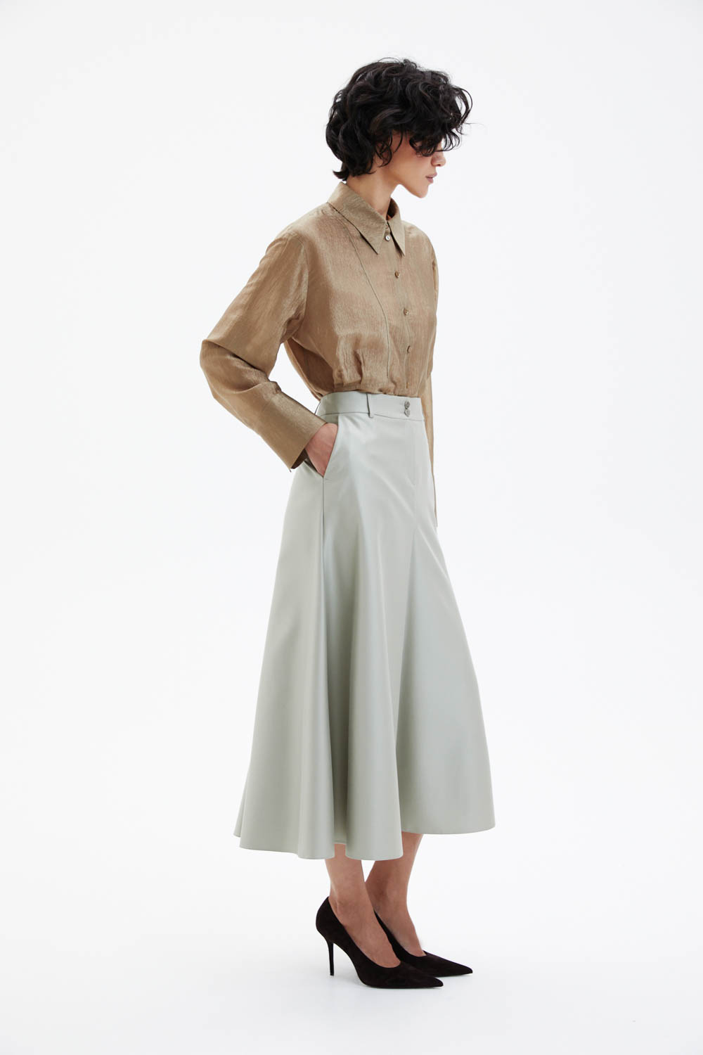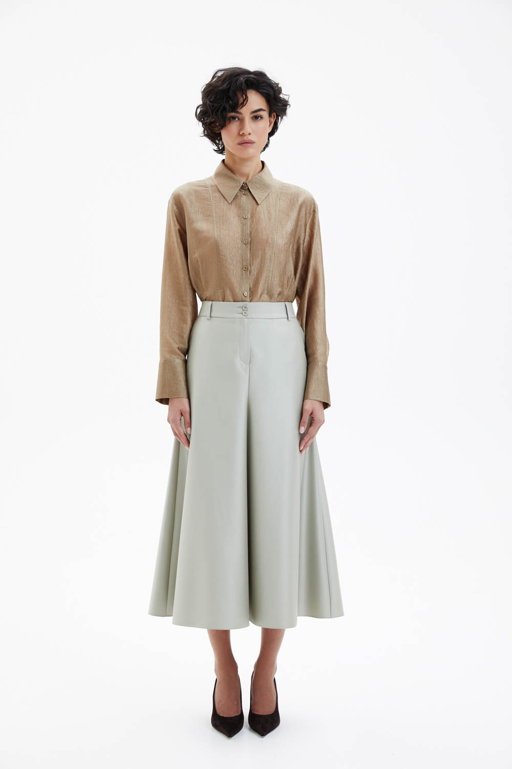 Плотная ткань с лёгким жемчужным отблеском придаёт модели выразительность, а передний средний шов, уходящий внутрь, создаёт интересный дизайнерский эффект. Два аккуратных передних кармана добавляют функциональности, при этом спинка остаётся гладкой. По внешнему виду модель напоминает юбку-брюки за счёт характерной линии кроя. Расклёшенная форма формирует чистый А-силуэт и обеспечивает красивое движение ткани при ходьбе. Структура материала подчёркивает графичность линий и помогает юбке держать форму, сохраняя аккуратную посадку в течение дня.