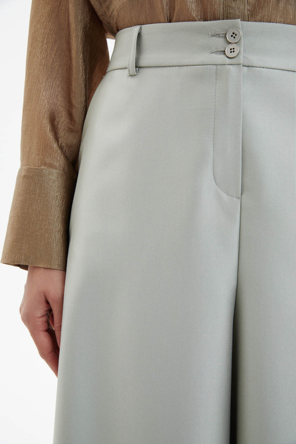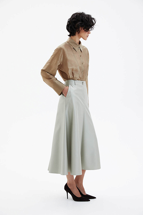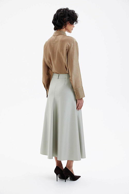 Юбка миди трапециевидного силуэта в элегантном цвете шалфея выполнена на притачном поясе и застёгивается спереди на молнию и две металлические пуговицы.