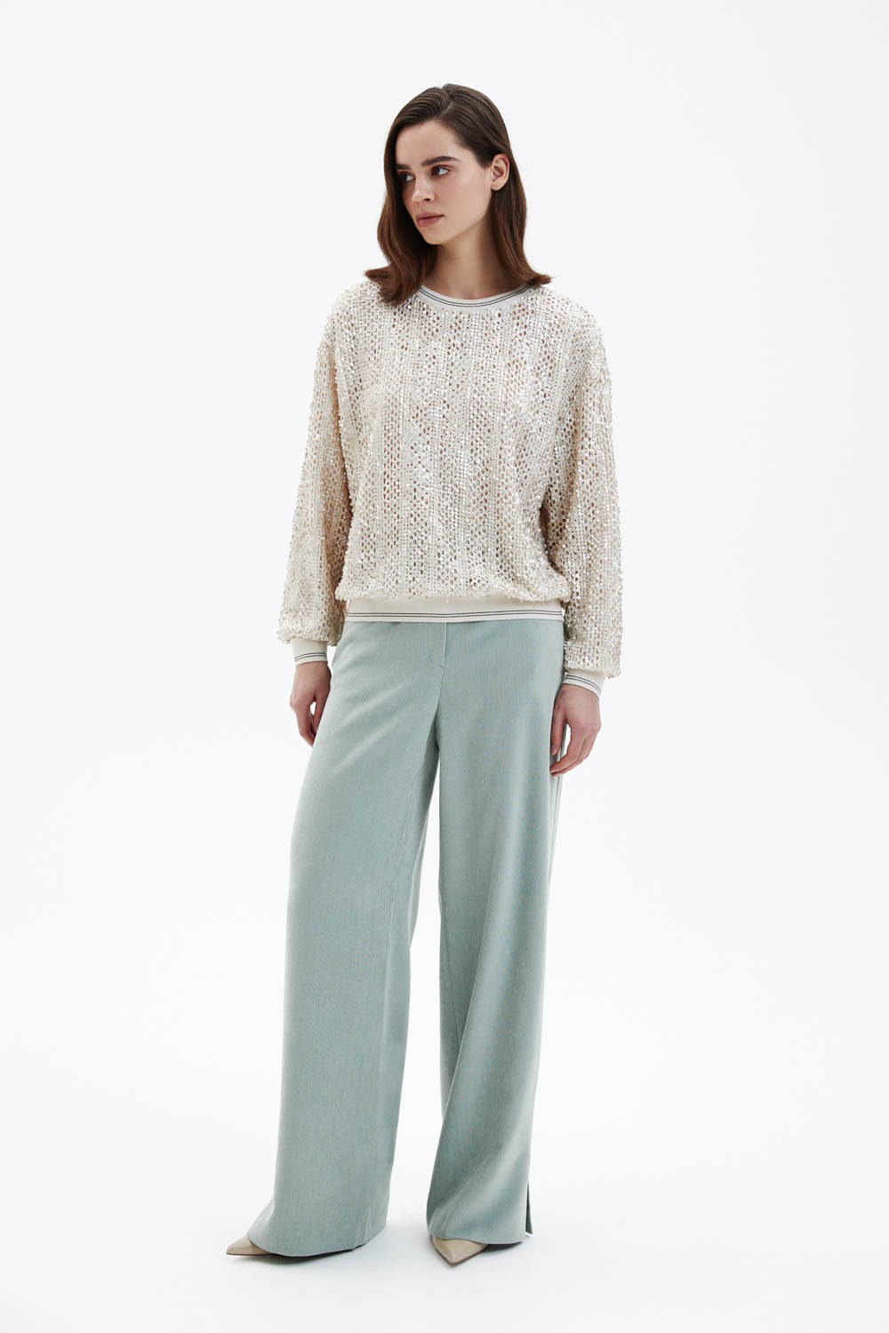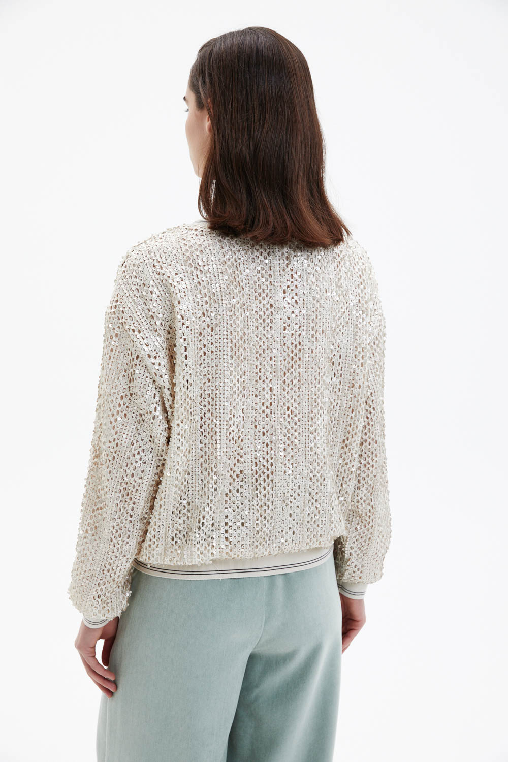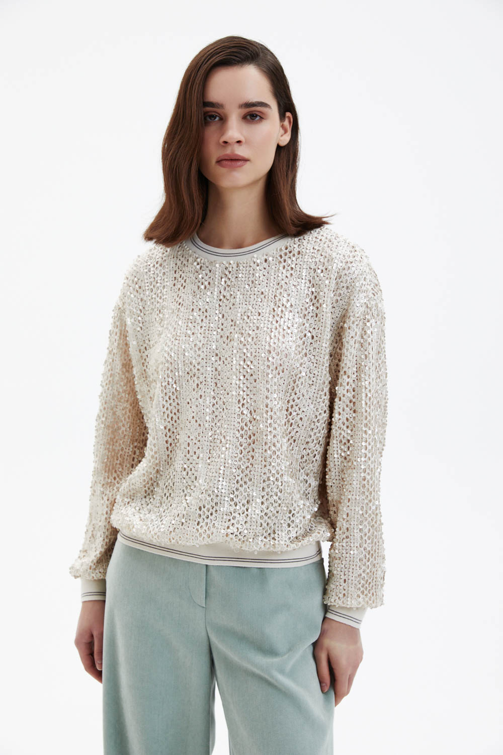 Свитшот свободного кроя выполнен из вязаного трикотажа молочно-бежевого оттенка с деликатной отделкой пайетками, создающими мерцание по всей поверхности изделия. Фактурная вязка придаёт модели выразительность и объём, сохраняя при этом лёгкость и комфорт. Округлая горловина, эластичная отделка по низу и манжетам формируют аккуратный, сбалансированный силуэт.