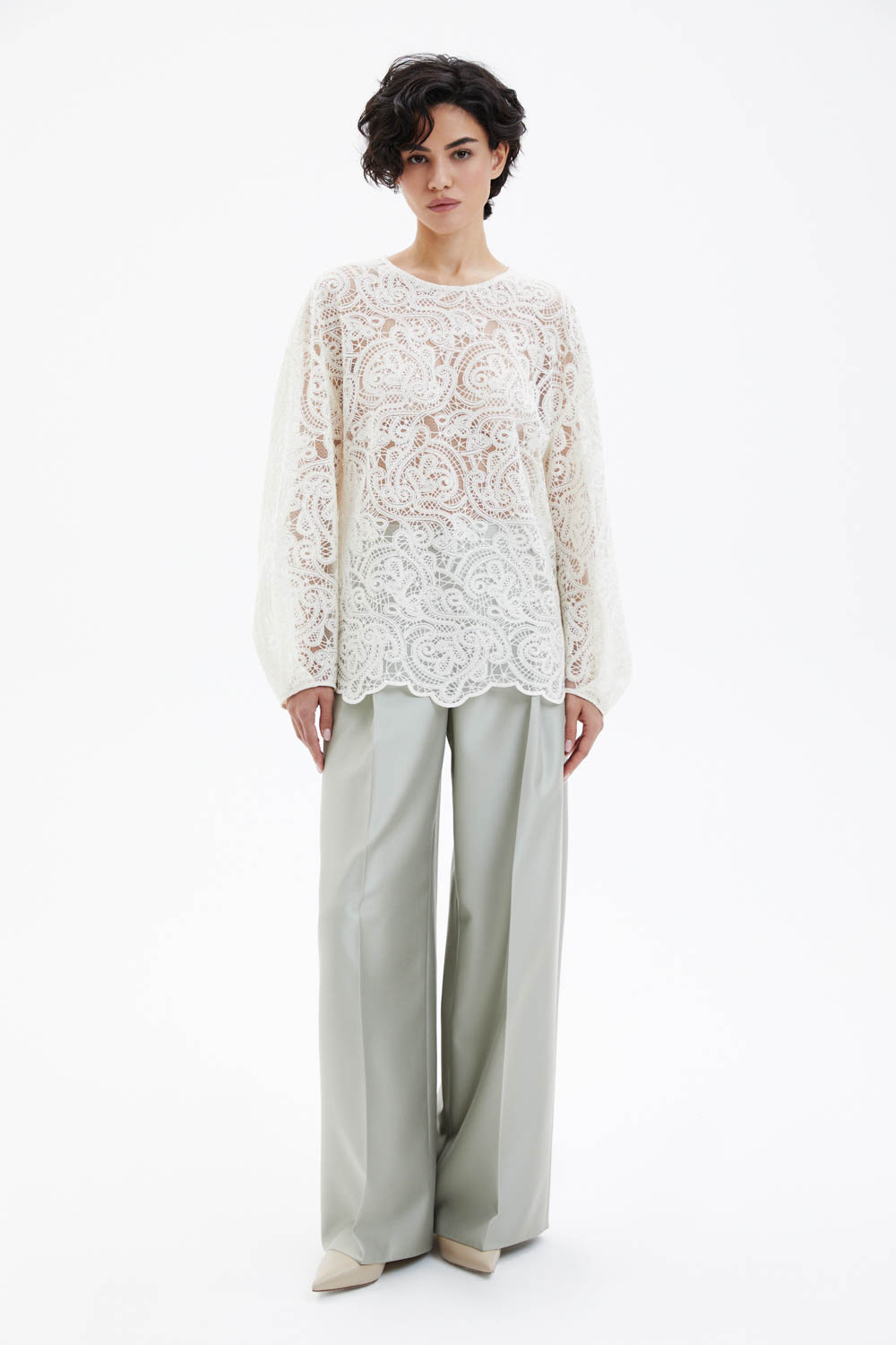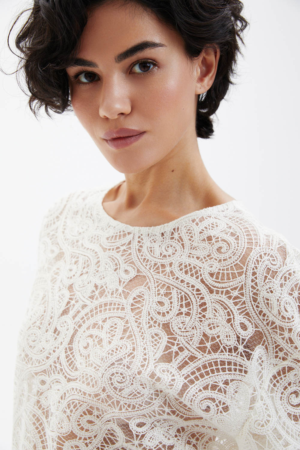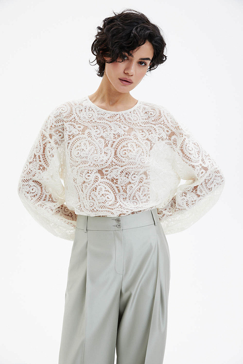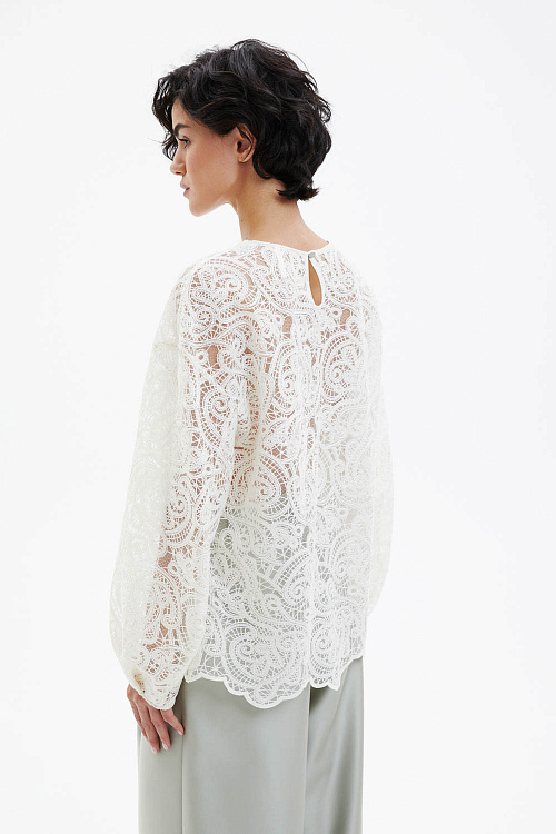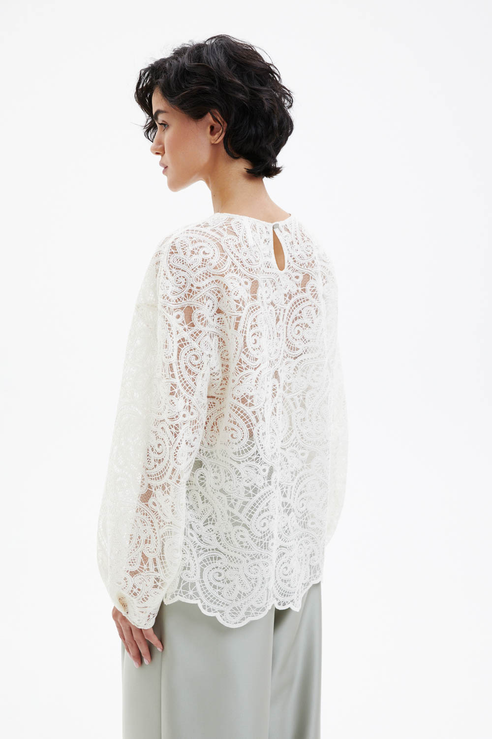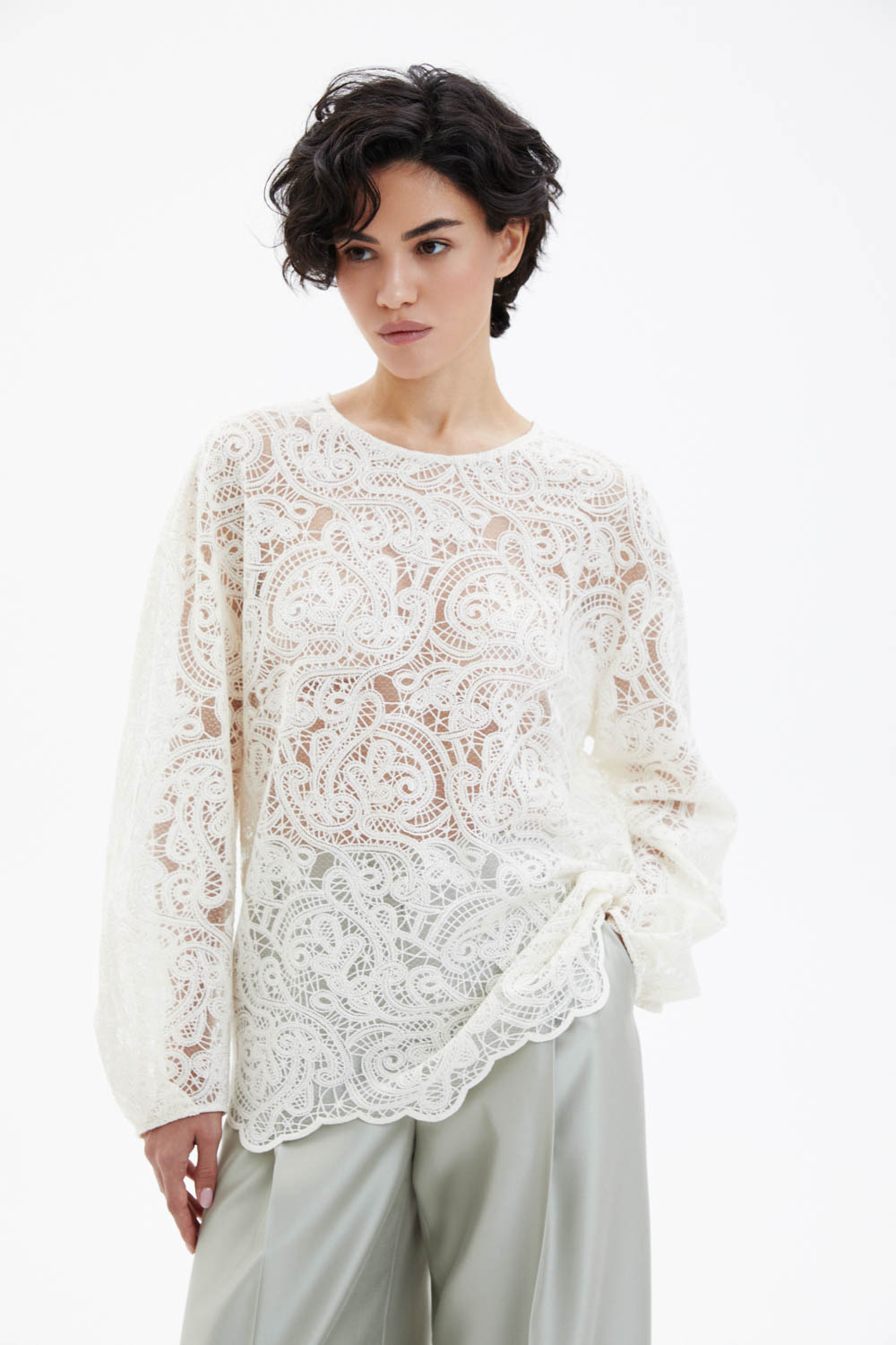 Блуза молочного цвета выполнена из тонкого кружевного полотна с выразительным орнаментальным узором. Модель прямого кроя дополнена округлой линией горловины и длинными рукавами с мягким объёмом, создающими лёгкий и воздушный силуэт. Полупрозрачная фактура кружева придаёт образу утончённость и подчёркивает женственный характер изделия.