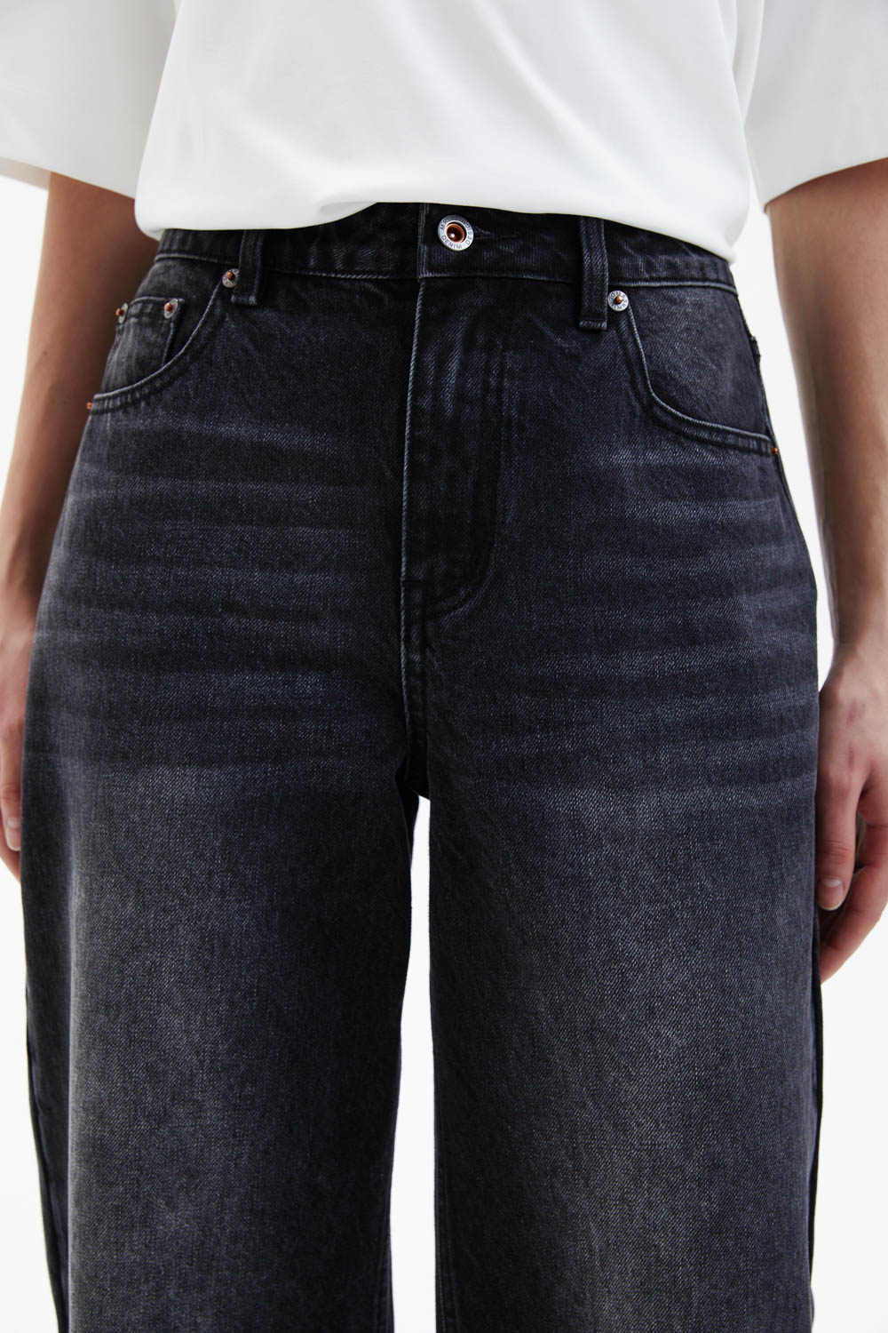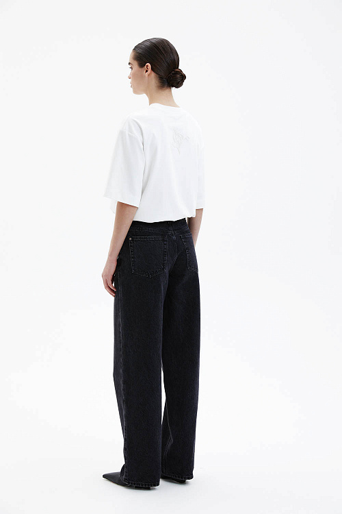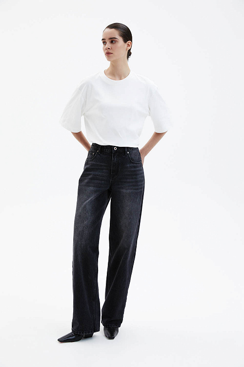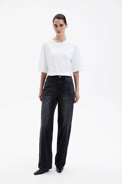 Джинсы прямого кроя тёмно-серого цвета выполнены из плотного денима с выраженной варёной фактурой. Модель со средней посадкой дополнена классическим поясом со шлёвками, застёжкой на пуговицу и молнию, а также функциональными карманами. Плотный деним хорошо держит форму и обеспечивает комфортную посадку при носке.