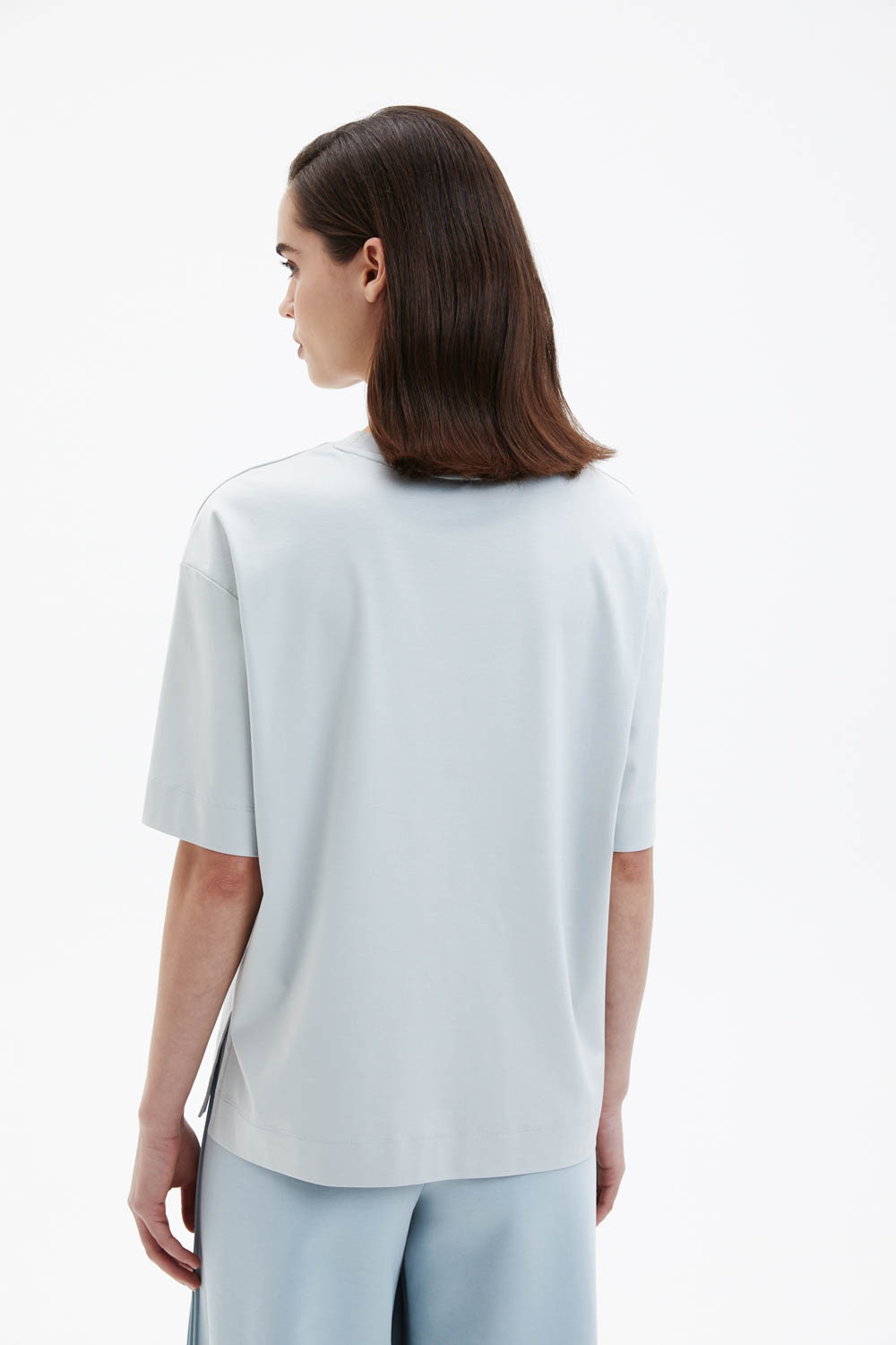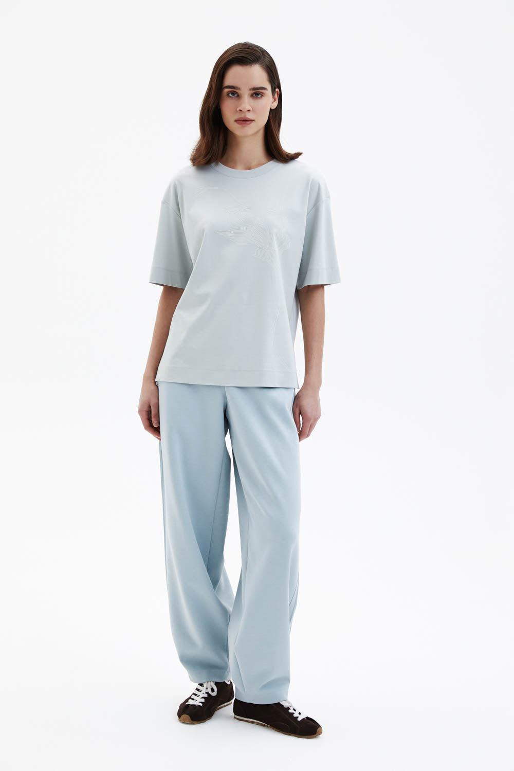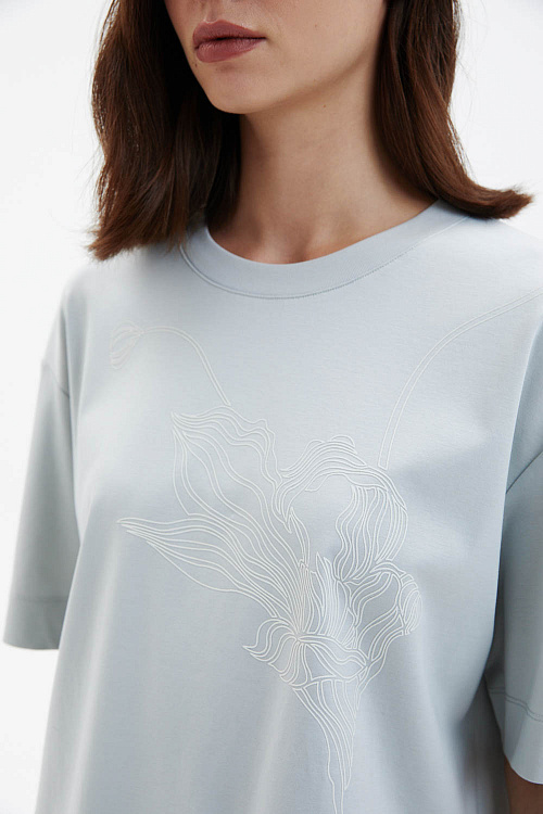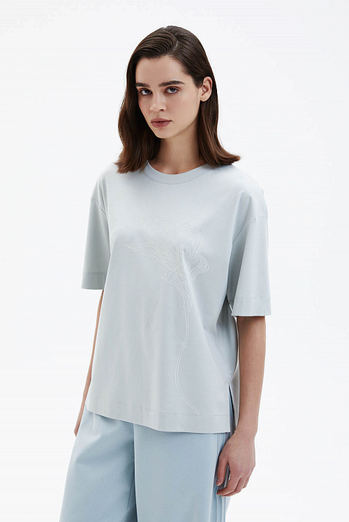 Футболка свободного прямого кроя выполнена из мягкого трикотажа светло-голубого оттенка. Округлая горловина и спущенная линия плеча формируют расслабленный силуэт. Декоративным акцентом модели служит белый принт с растительным мотивом, который добавляет образу графичность и выразительность.