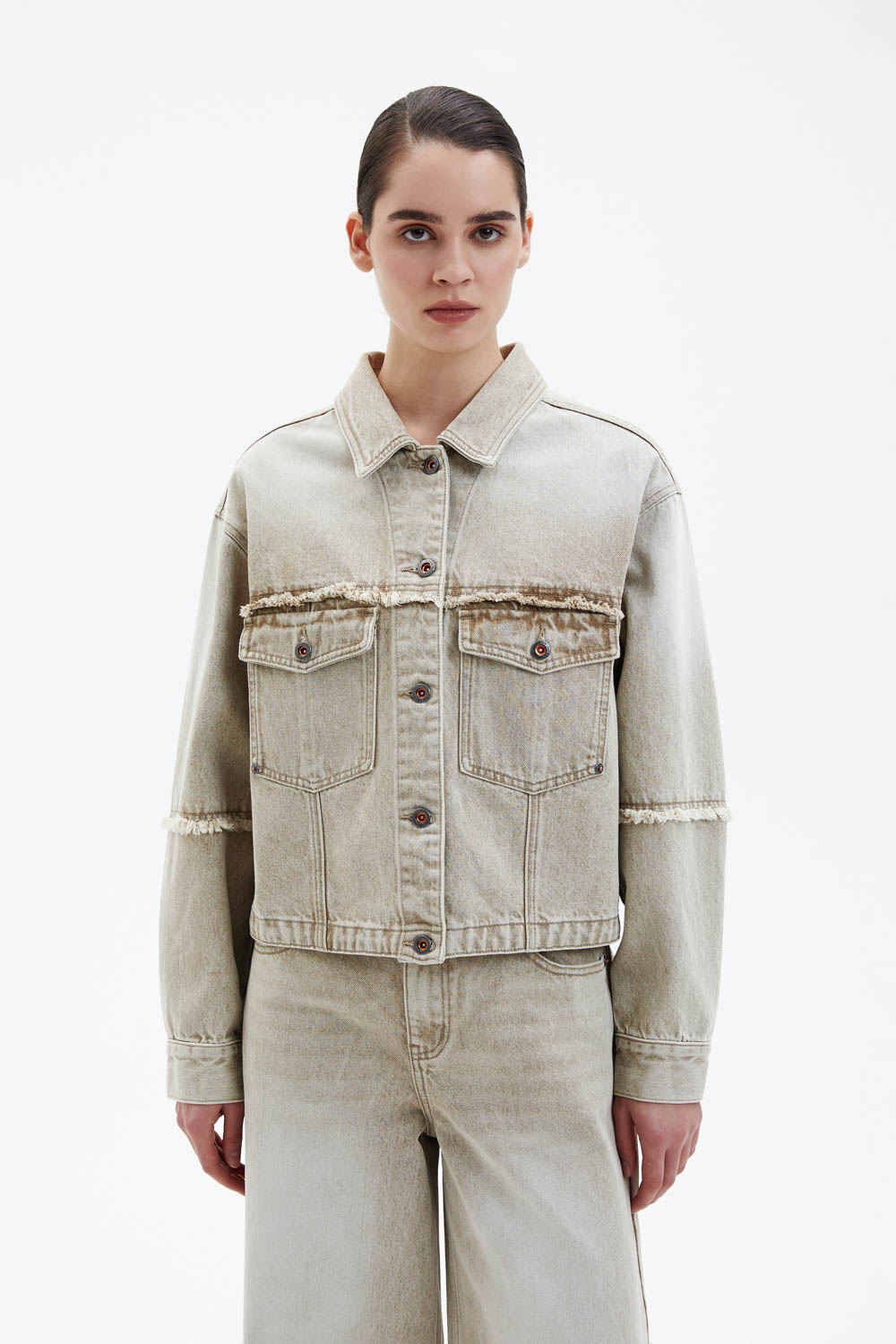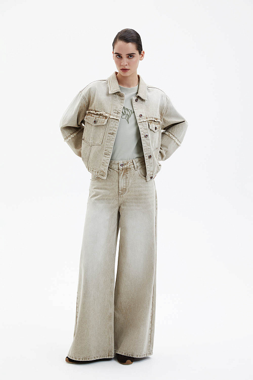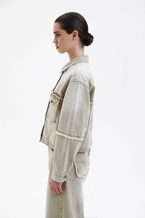 Джинсововая куртка прямого кроя светло-бежевого цвета выполнена из плотного денима с мягкой, слегка выстиранной фактурой. Классический отложной воротник, застёжка на металлические пуговицы и накладные карманы подчёркивают лаконичный характер модели. Декоративные швы с эффектом необработанного края добавляют образу фактурности и современного акцента.