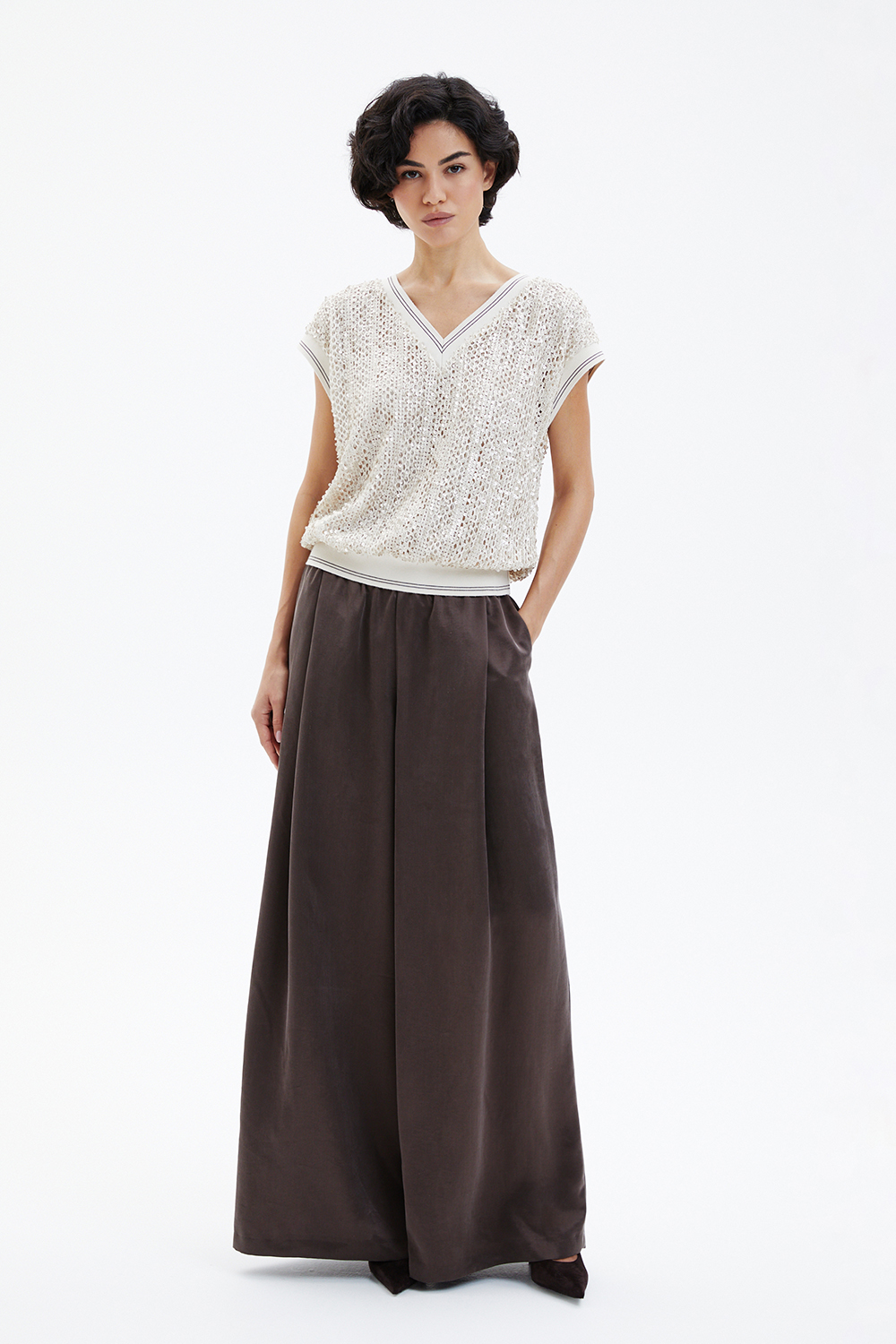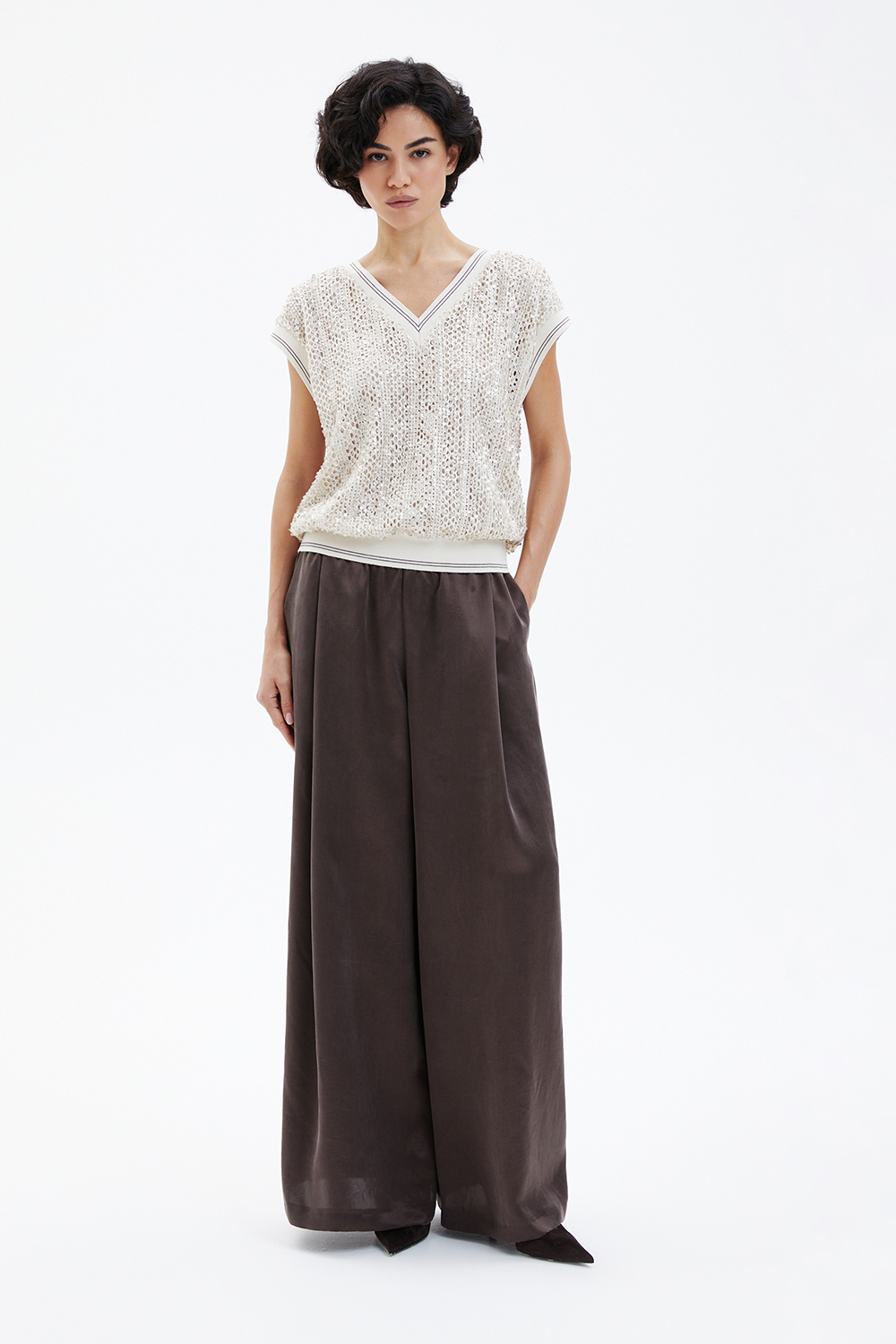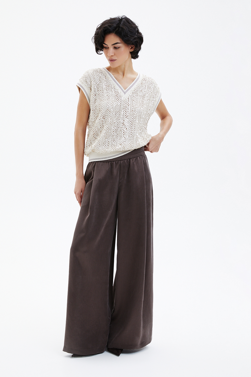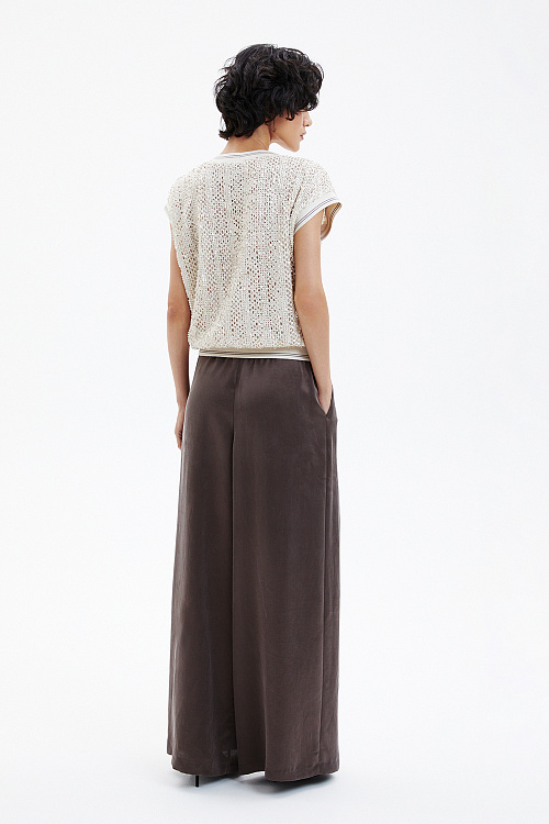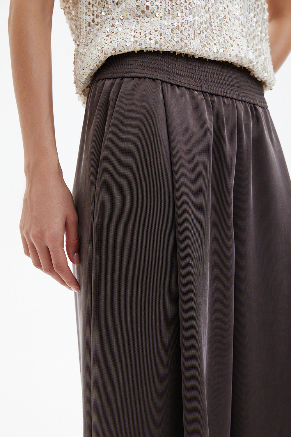 Широкие брюки из струящегося купро цвета мокко имеют лёгкий матовый блеск. Широкий эластичный пояс обеспечивает комфортную посадку, а защипы по переду формируют аккуратный объём и создают выразительный силуэт.