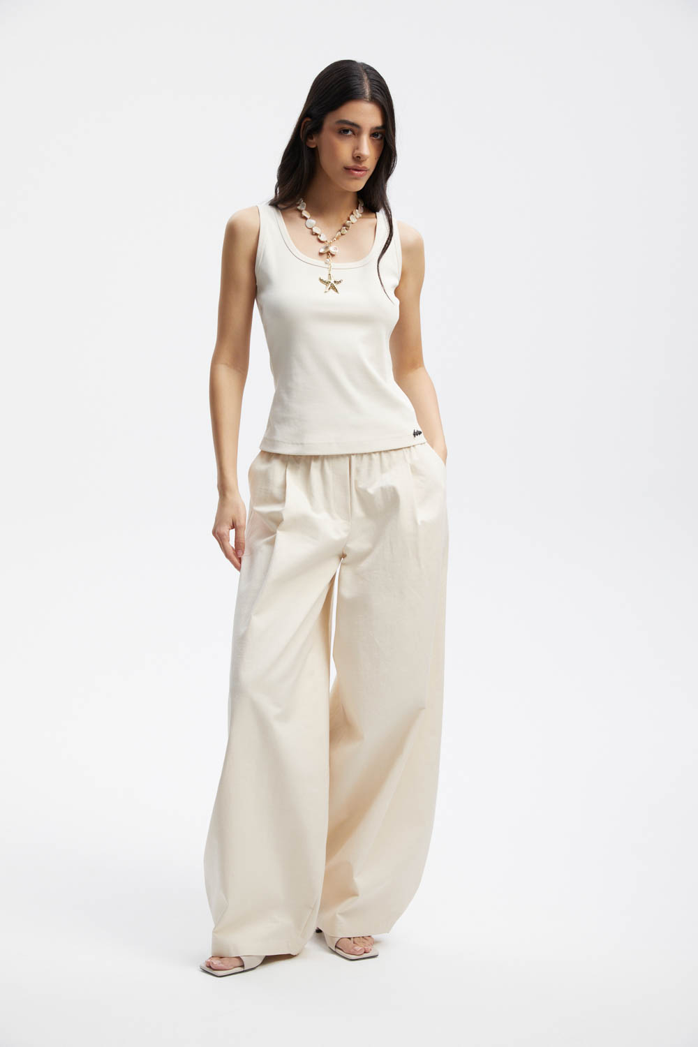 Бежевые брюки.