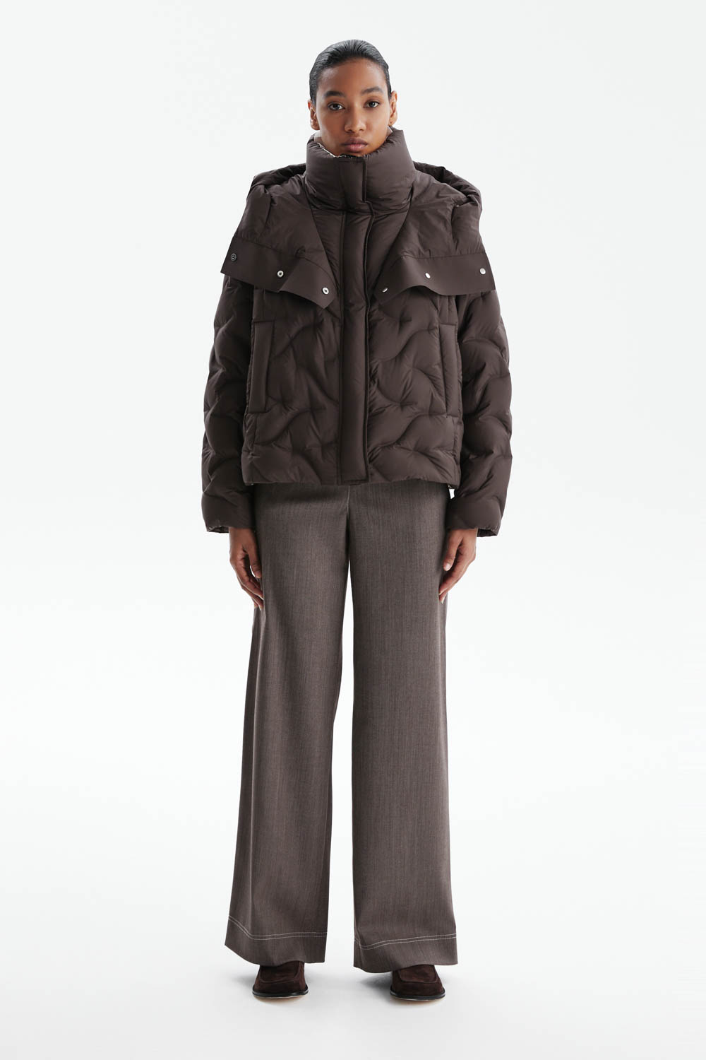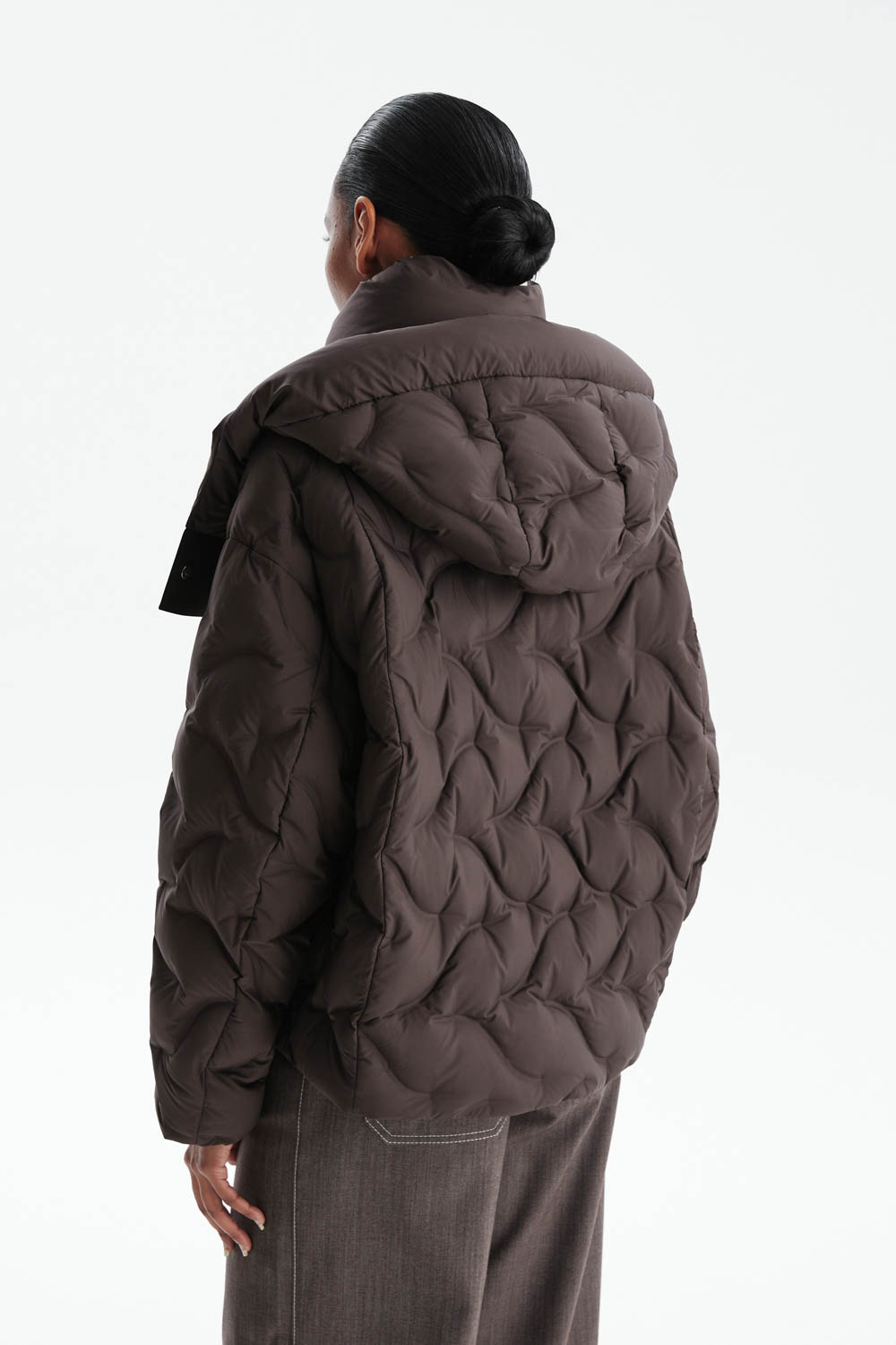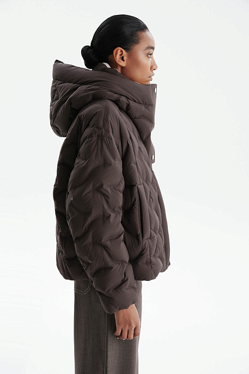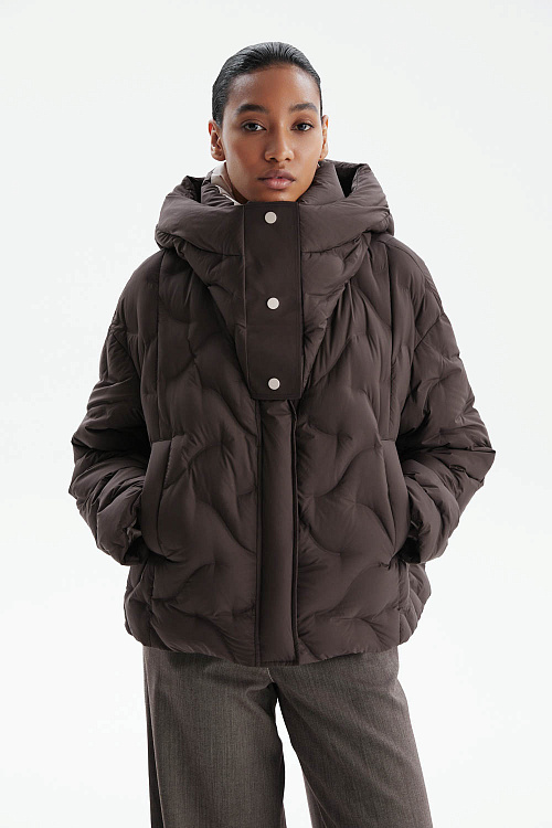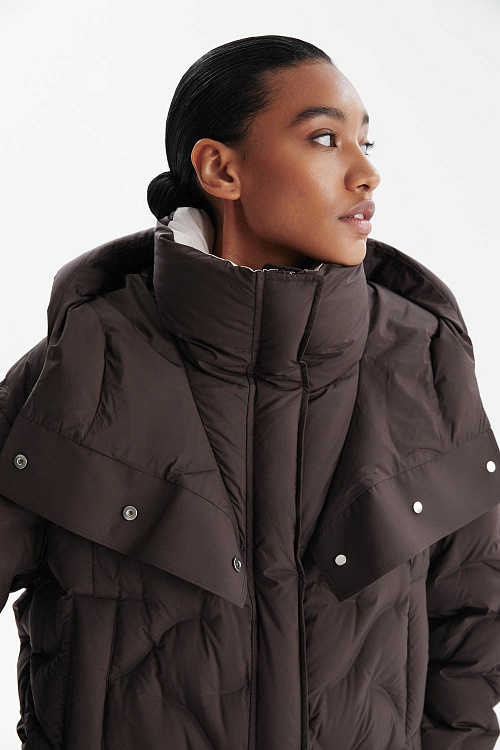Пуховик прямого силуэта в насыщенном шоколадном оттенке сочетает современный минимализм и практичность.