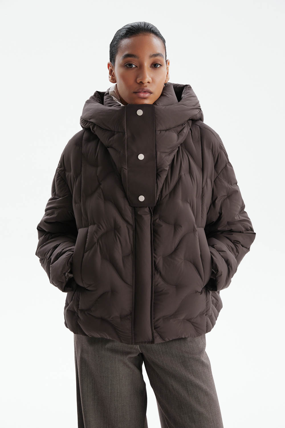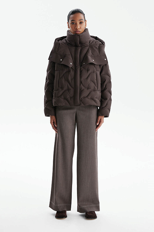 Высокий воротник-стойка и объёмный капюшон со стойкой надёжно защищают от ветра и холода, а центральная застёжка на молнию со скрытой планкой на магнитных кнопках сохраняет лаконичность и комфорт. Уникальная стёжка создаёт выразительный объёмный рисунок, придавая модели динамику и современный характер.