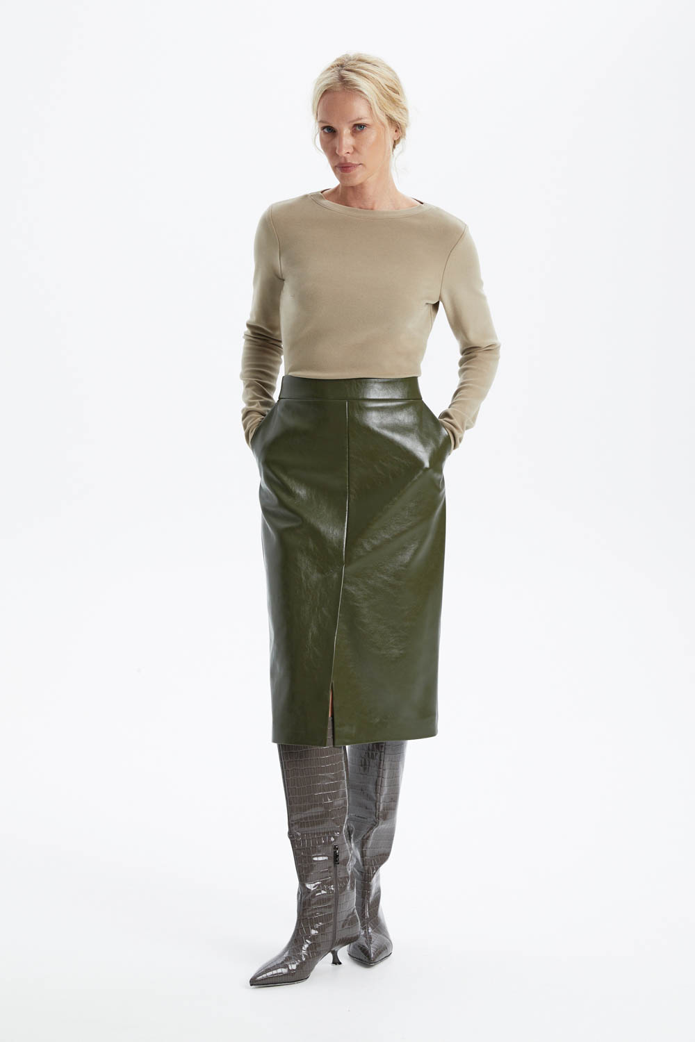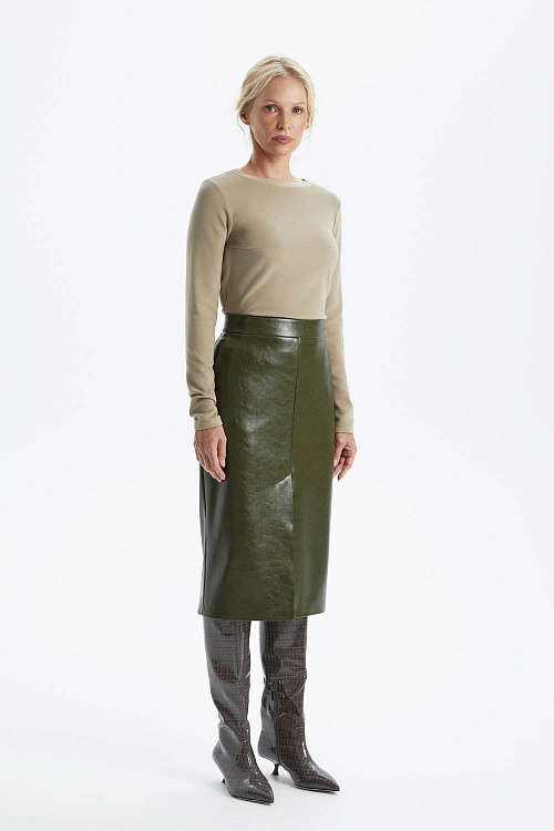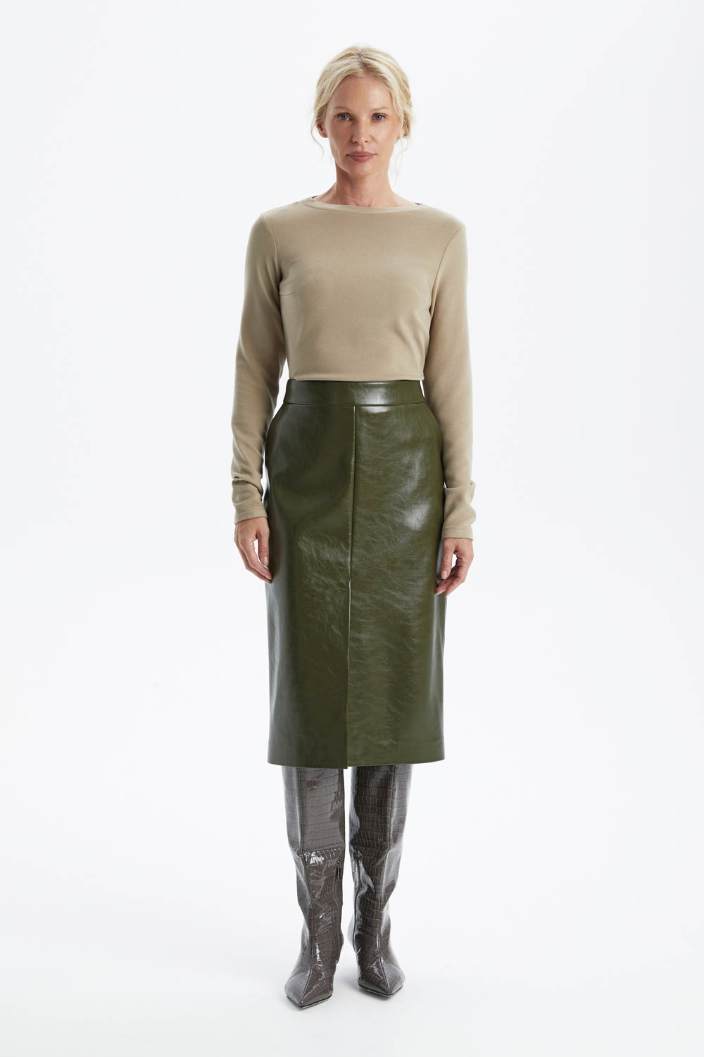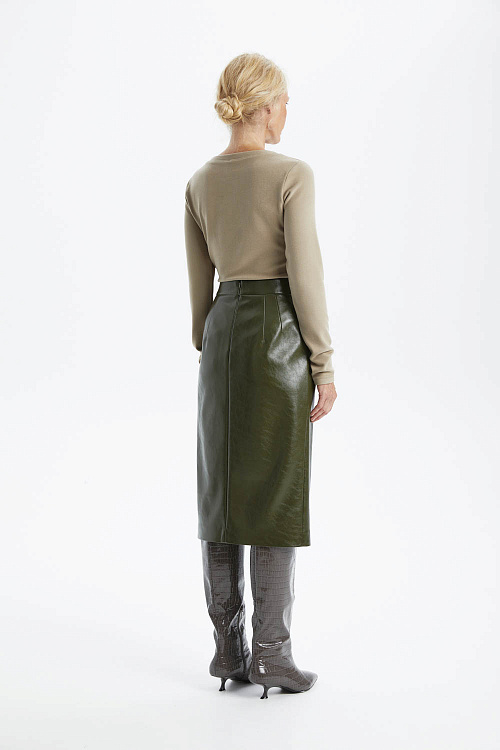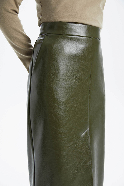 Эффектная миди-юбка прямого силуэта выполнена из мягкой фактурной искусственной кожи глубокого оттенка хаки, который подчёркивает элегантность и современный характер модели.