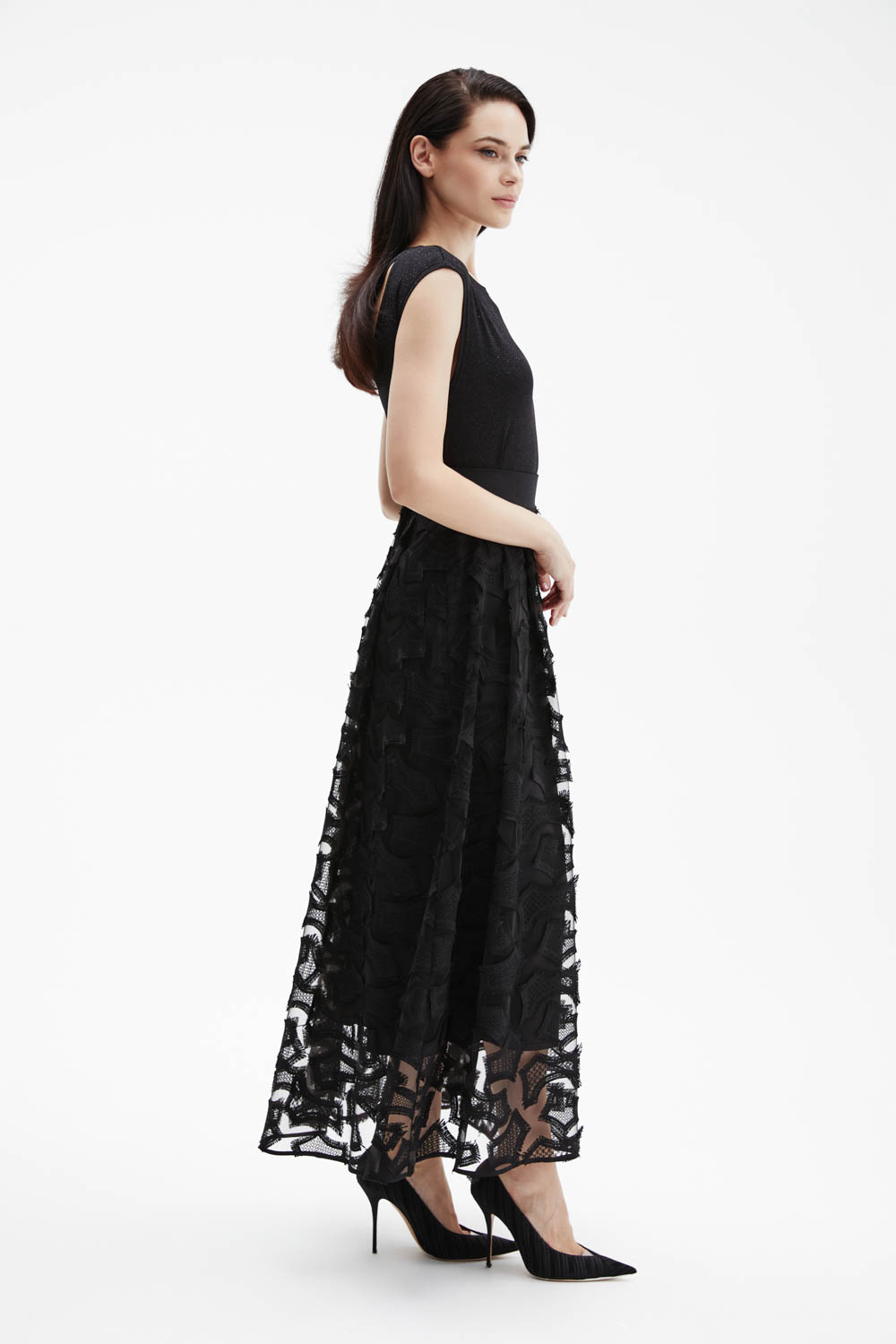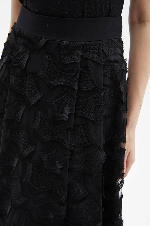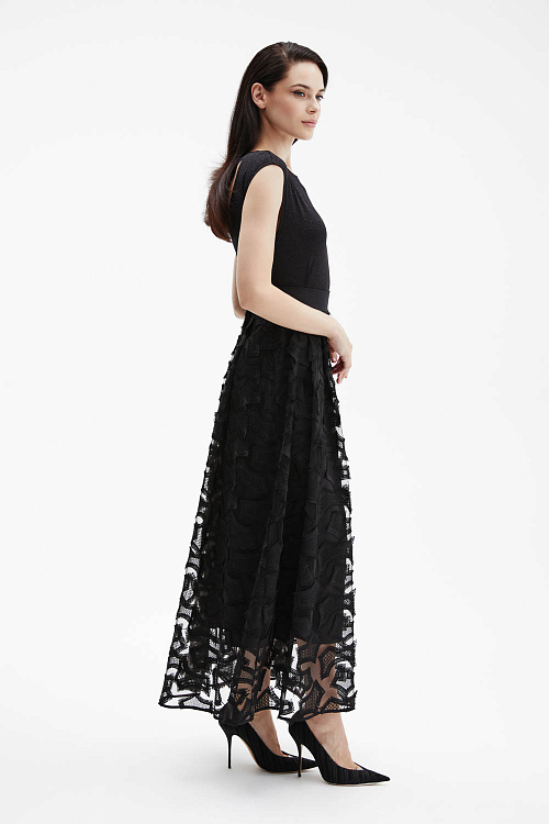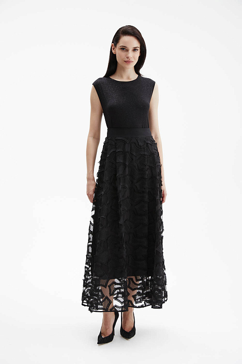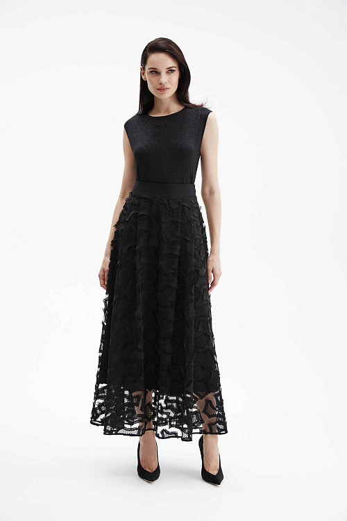 Черная эффектная юбка макси А-силуэта сочетает два слоя: верх из чёрной сетки с фактурной вышивкой и нижний из струящегося атласа.