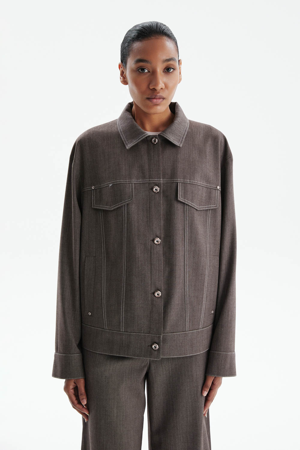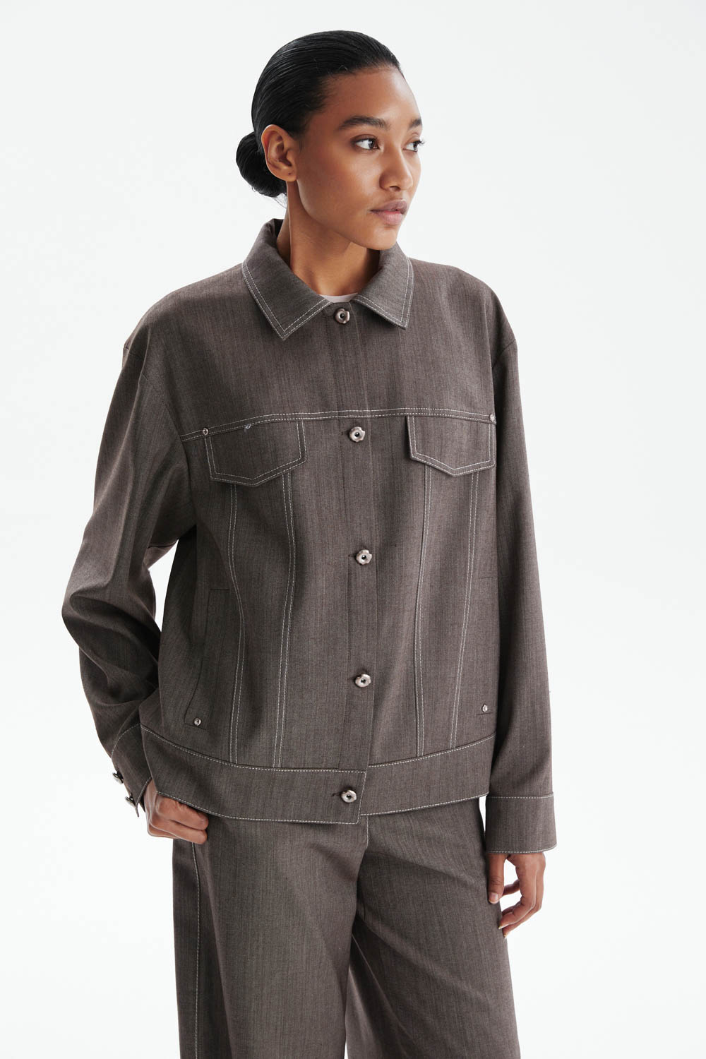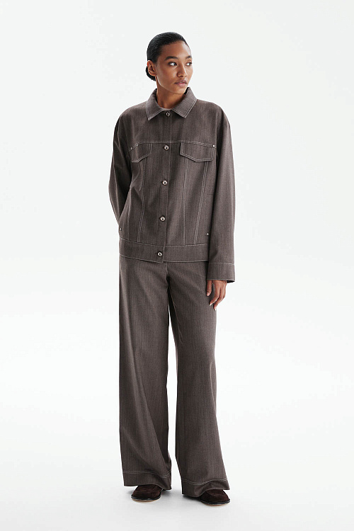 Жакет свободного прямого кроя в благородном серо-коричневом оттенке — современная интерпретация классики с элементами, вдохновлёнными дизайном джинсовой куртки.