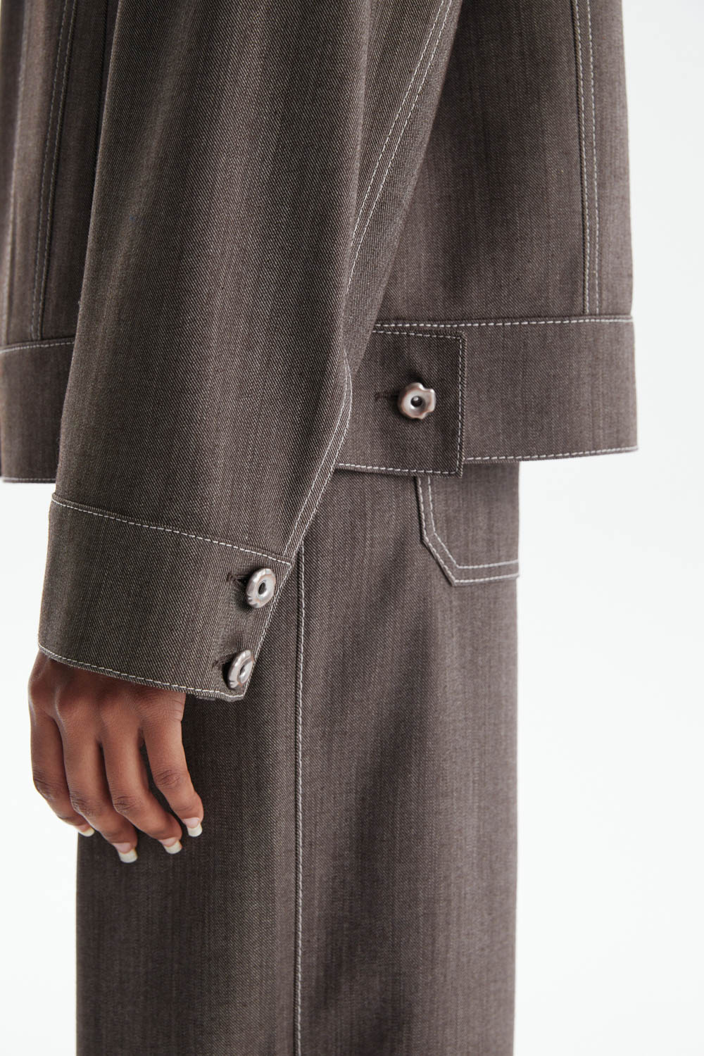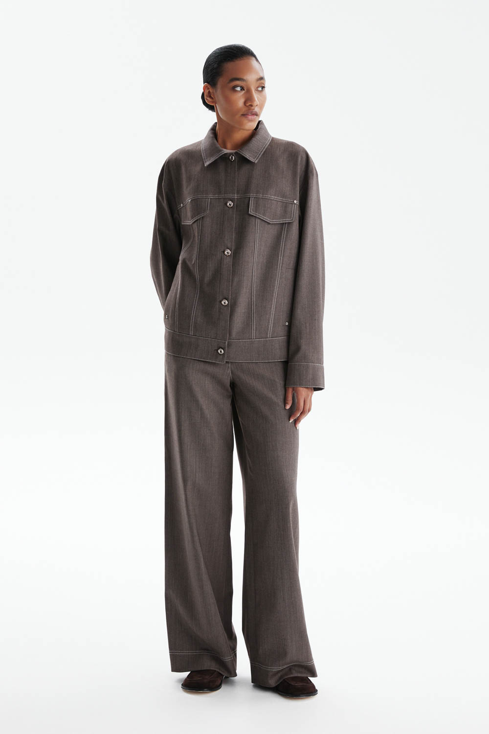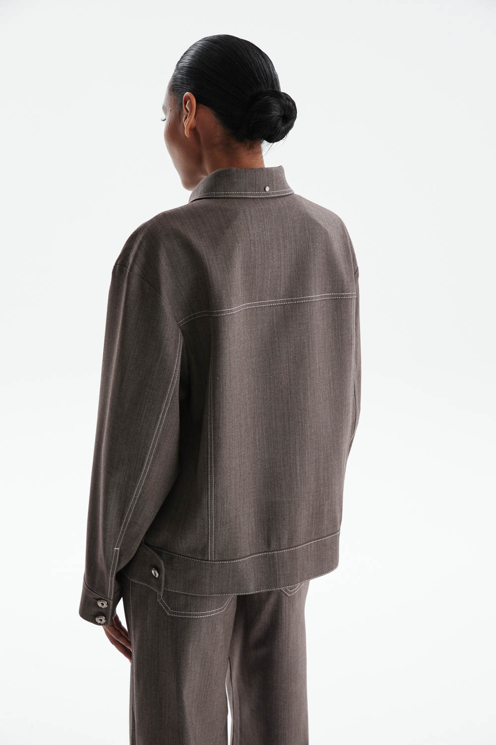 Жакет свободного прямого кроя в благородном серо-коричневом оттенке — современная интерпретация классики с элементами, вдохновлёнными дизайном джинсовой куртки.