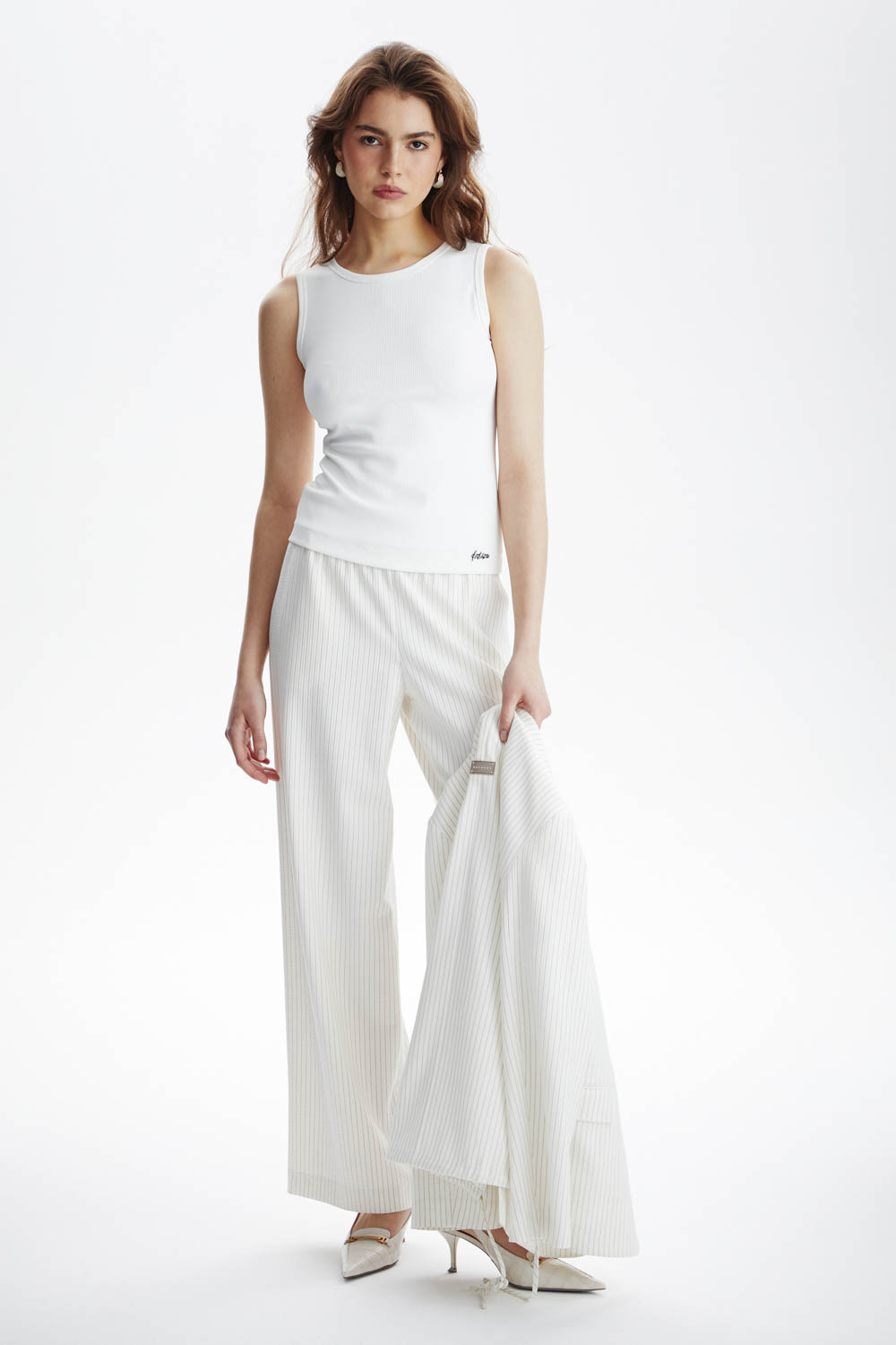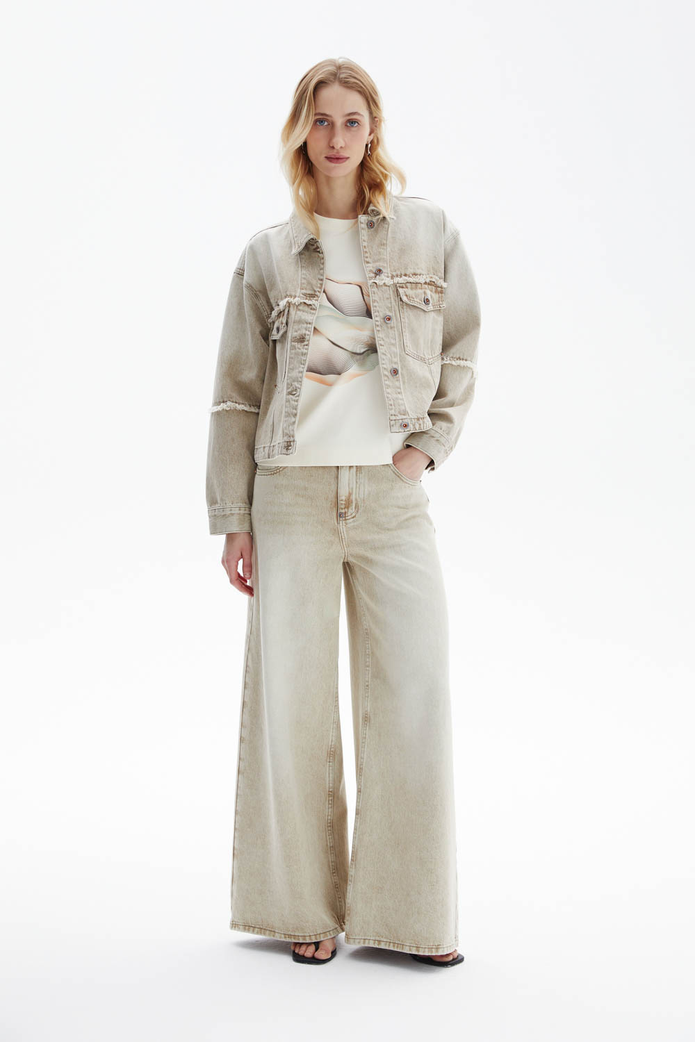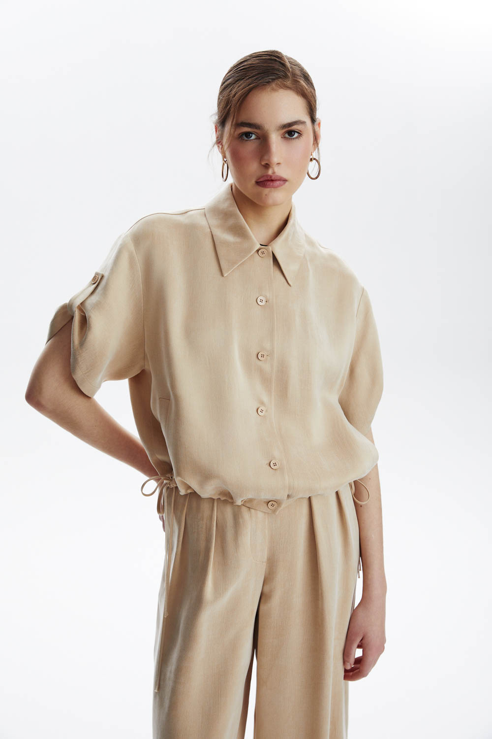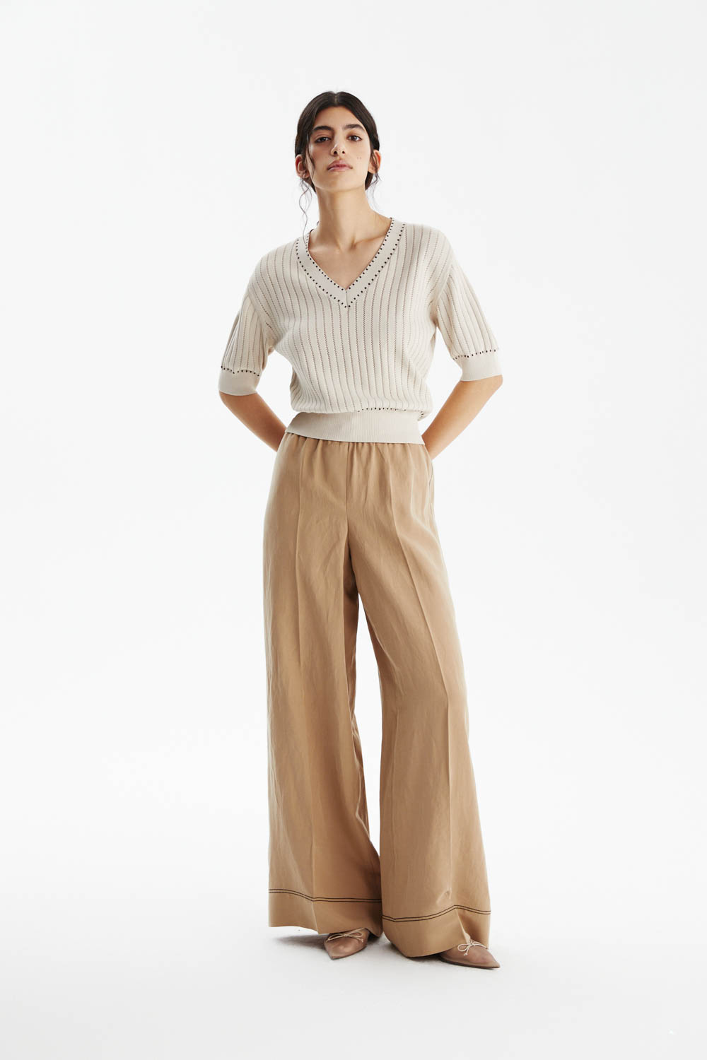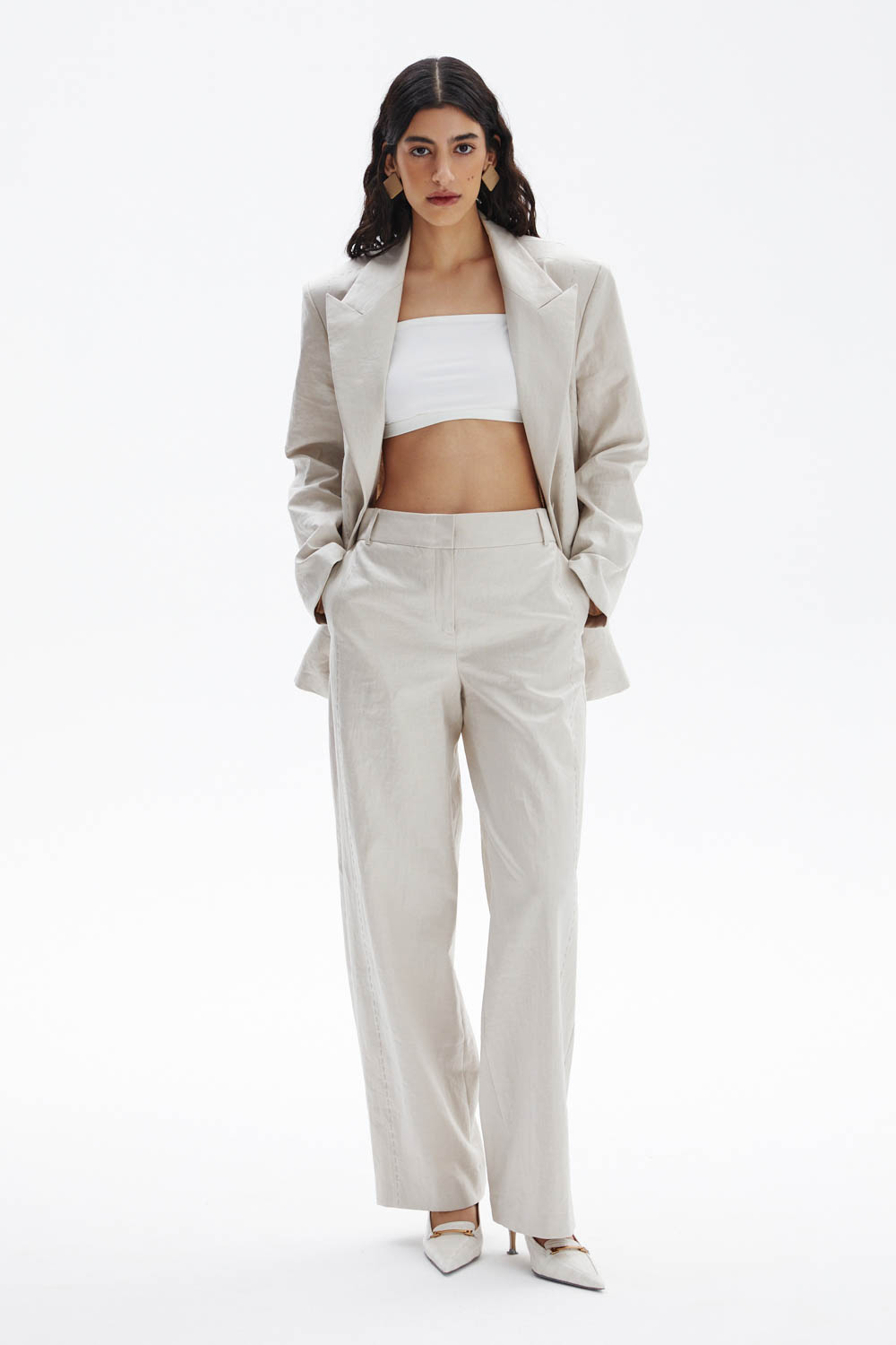 Бежевые брюки.